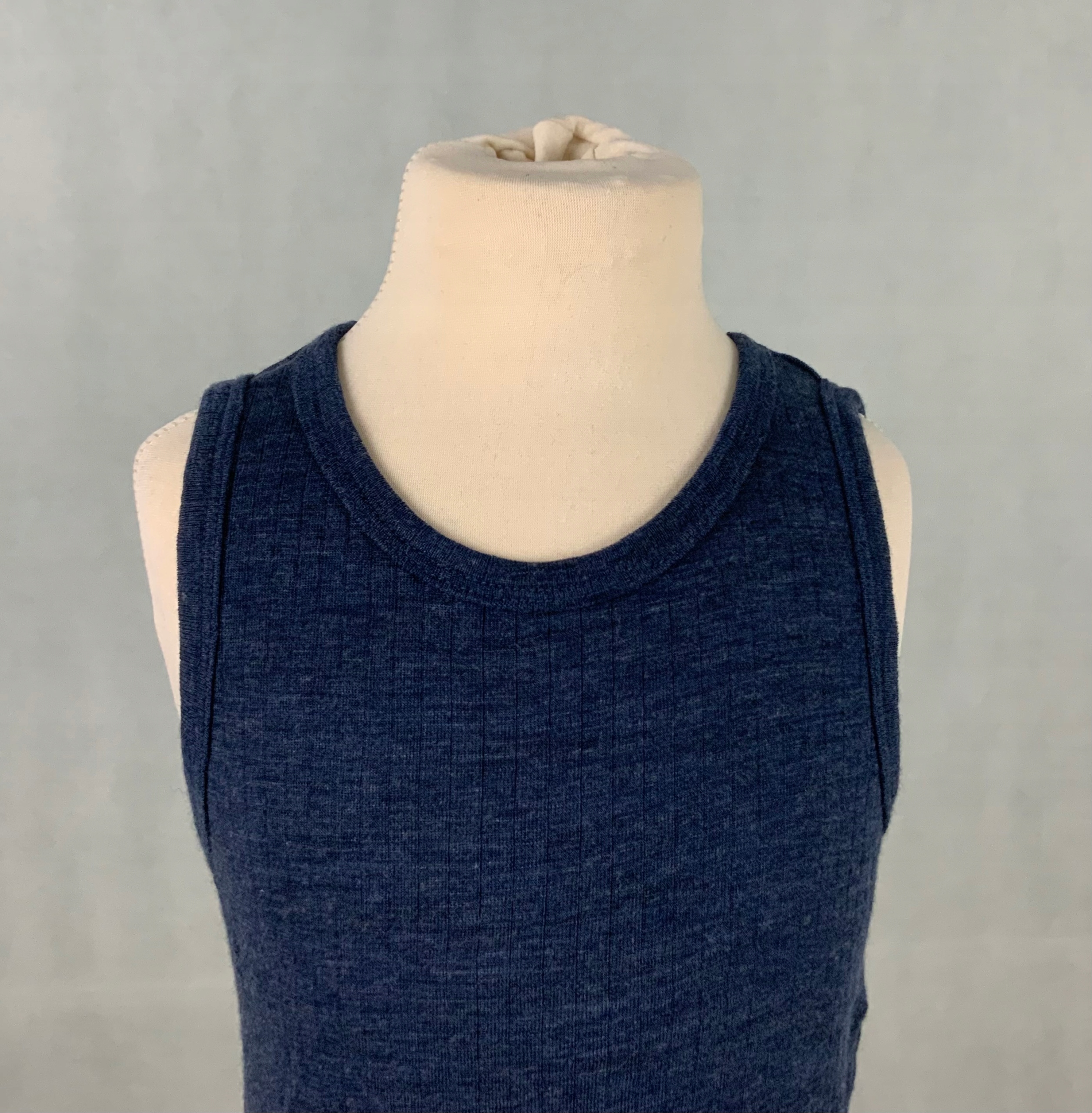 М'який вовняний топ темно-синього кольору меланж, на широких бретелях. Тканий з вертикальними смужками