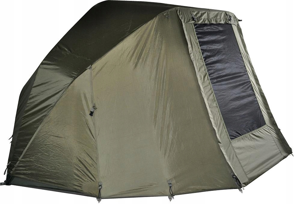 Сучасний намет із зовнішньою алюмінієвою рамою на трьох стовпах. Конструкція призначена для мобільних рибалок на коропа, яким потрібне