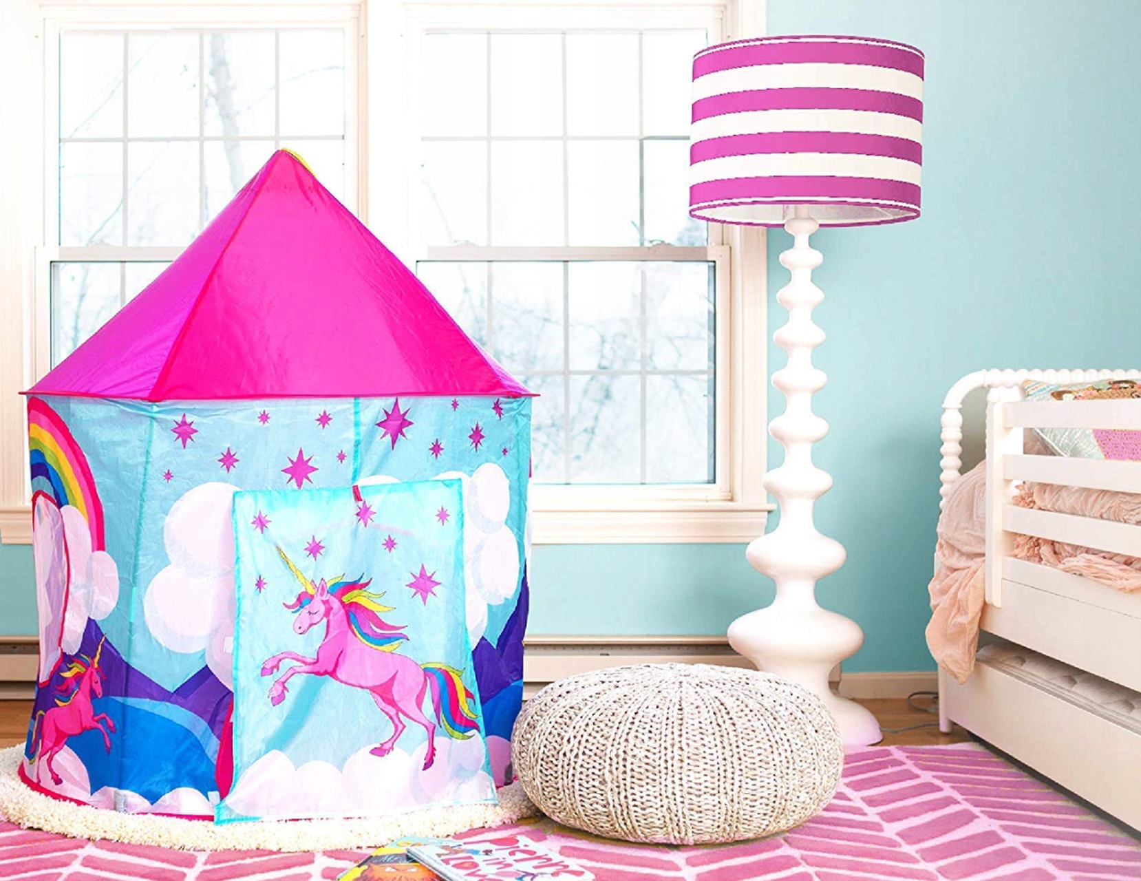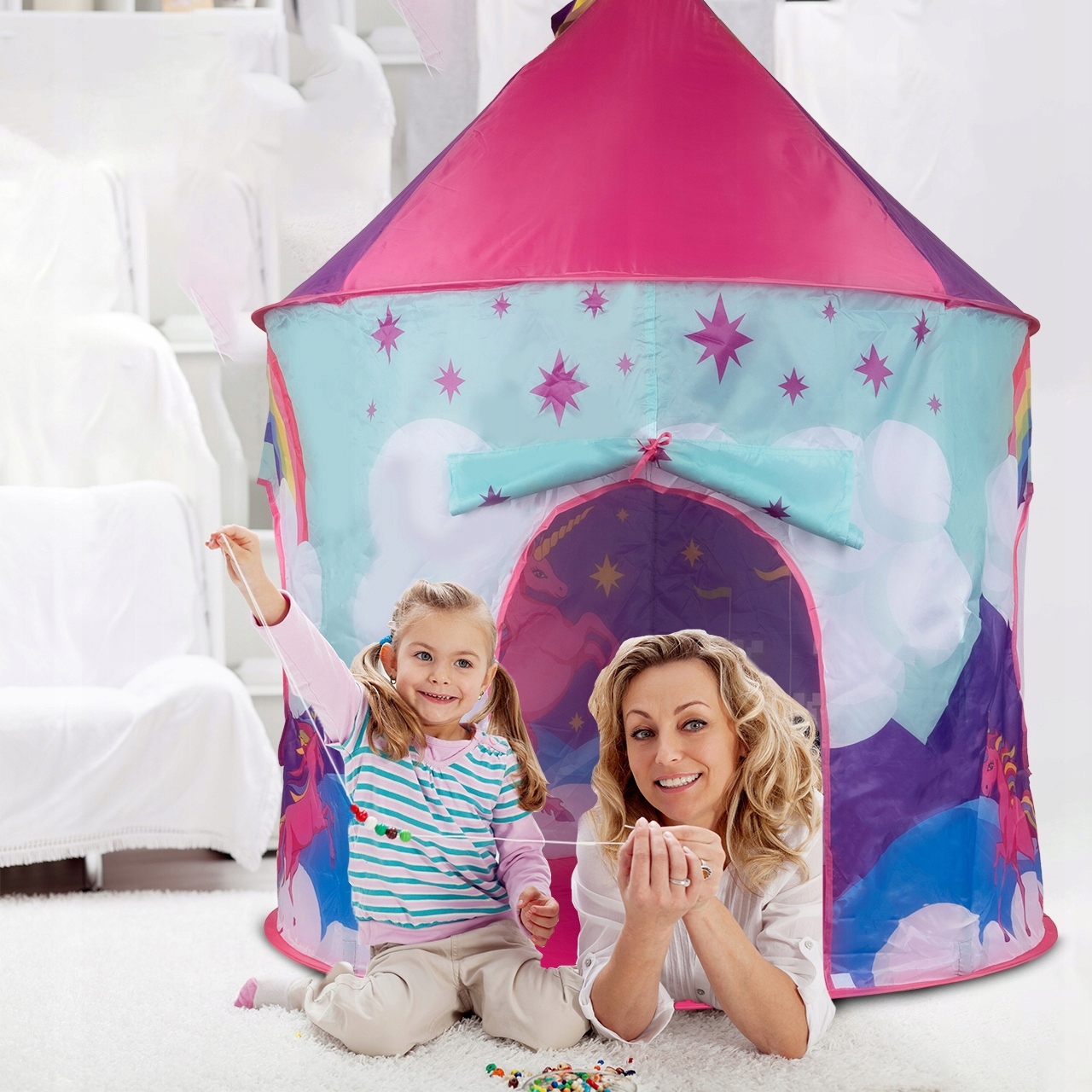 Наш продукт вдосконалено до найдрібніших деталей. Різнокольорові, чарівні картинки - веселка, єдинороги, зірки... все це допоможе вам відчути себе справжньою принцесою в справжньому замку! Намет має вхід, який можна зав’язати зверху або залишити закритим.