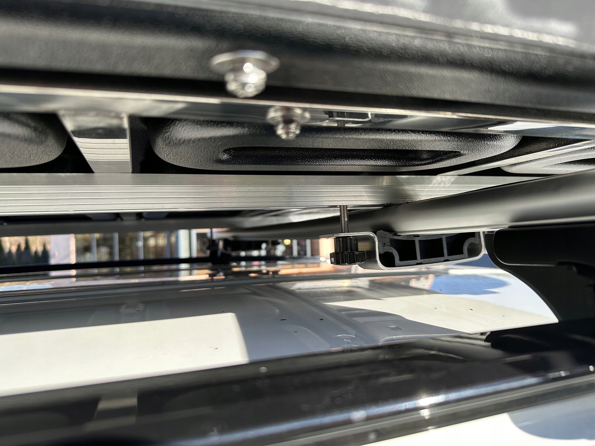 - Кріплення намету регулюються - вони ковзають уздовж довшої сторони намету, що дозволяє регулювати їх відповідно до відстані між балками або перекладинами багажник автомобіля.