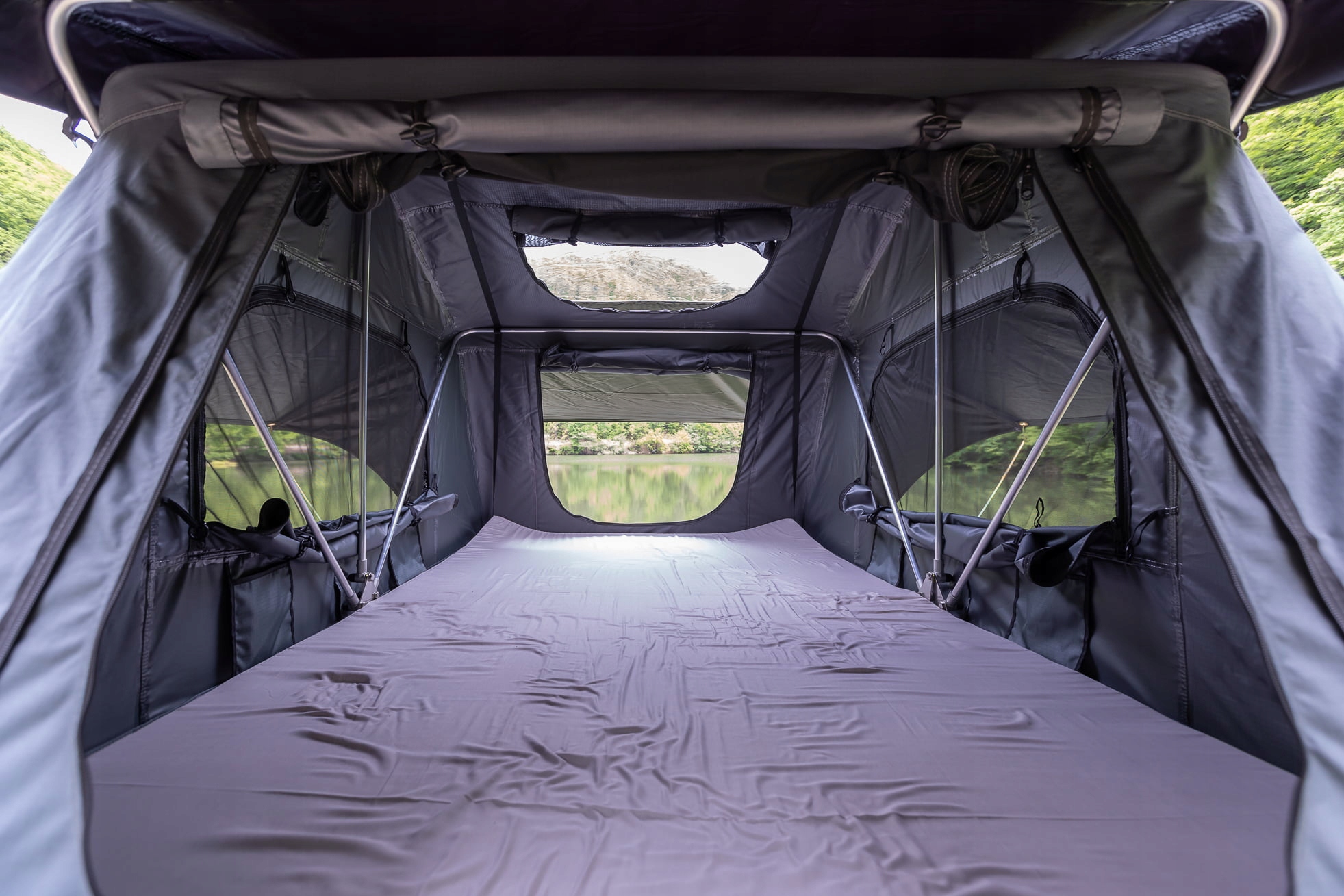 Намет оснащений вікном ПВХ, інтегрованим з дахом, що забезпечує доступ до природного світла до інтер’єру та прекрасного виду зоряного неба. Бічні вікна були додатково обладнані сітками для комах, які гарантують адекватну вентиляцію та захист від комах.