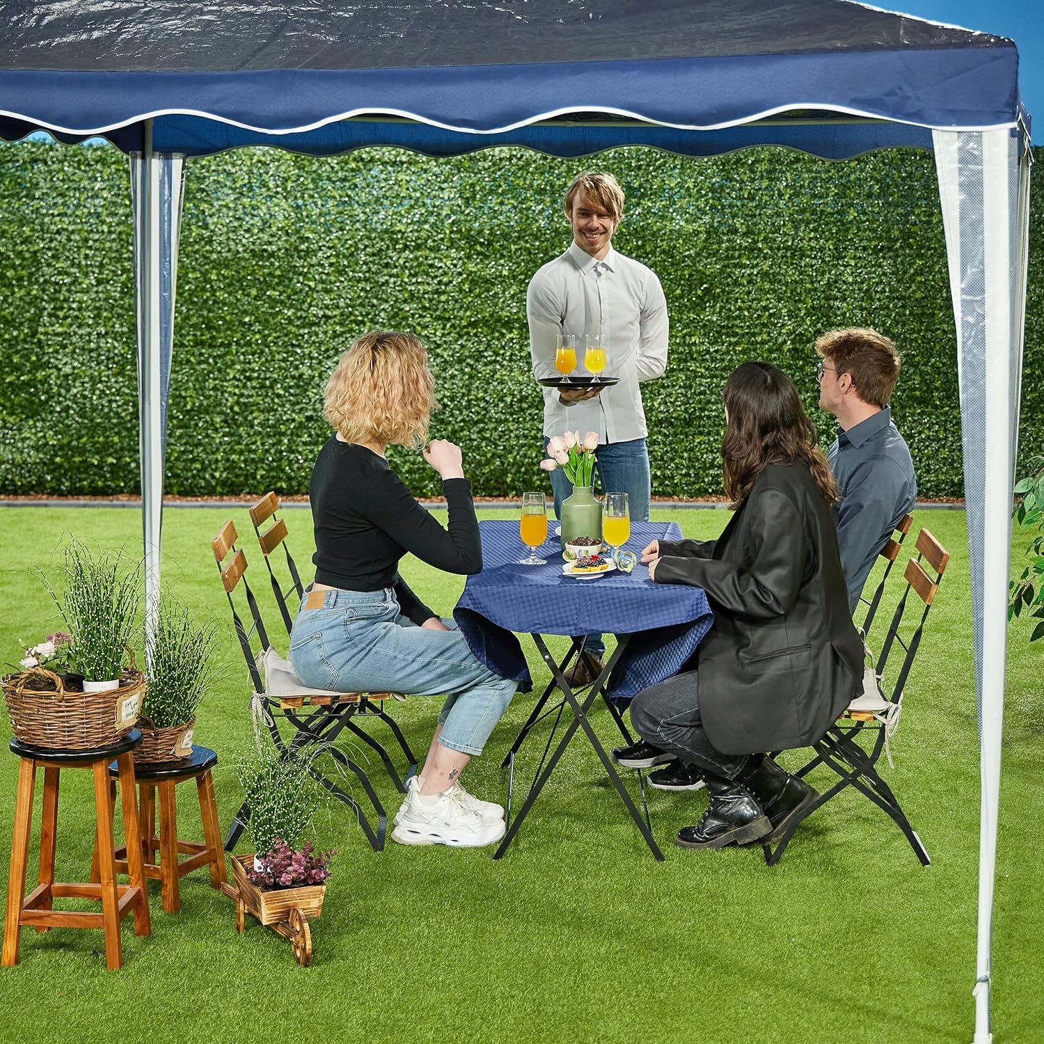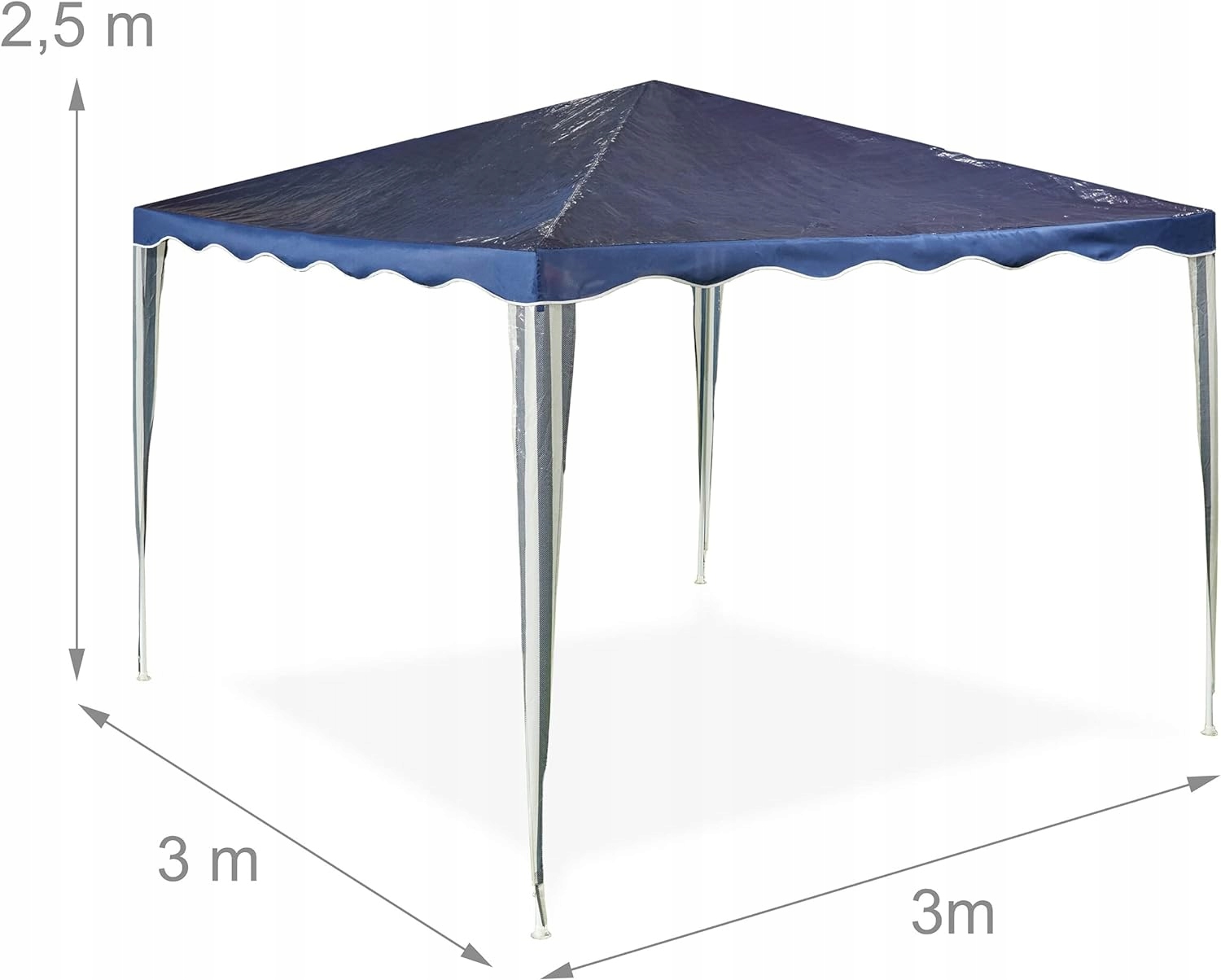 Чи для диких вечірок у саду, для спокійних вечорів барбекю чи затишних зустрічей за кавою - з павільйоном ви можете сповна насолодитися теплою порою. Садовий намет служить джерелом тіні від яскравого сонця та забезпечує захист від несподіваних злив. Намет для вечірок складається з водонепроникного даху та міцного сталевого каркасу, який можна зібрати миттєво завдяки практичній системі роз’ємів. Терасовий намет можна безпечно прикріпити за допомогою мотузок і кілочків, що входять у комплект. Деталі павільйону - розміри (висота x ширина x глибина): приблизно 2,5 x 3 x 3 м. Висота проходу: приблизно 1,95 м. Вага: приблизно 5,7 кг - Матеріал: ПЕ (90 г/м²), сталь. Колір: темно-синій, білий. Непогодостійкий намет для вечірок у саду - Ідеально підходить для барбекю, днів народжень та інших святкувань - Для відпочинку на свіжому повітрі з сім'єю та друзями - Практичний захист від дощу - Стійкий до розривів, водонепроникний, атмосферостійкий поліетиленовий матеріал - Міцний сталевий каркас гарантує стабільність - Легке та швидке встановлення завдяки до вставної системи - трос в комплекті. і кілочки для безпечного та надійного кріплення Комплект поставки: 1 x Різдвяний павільйон по частинах - 4 x мотузка - 8 x інструкції з оселедців (можуть бути недоступні польською мовою) - декоративні елементи не входять до обсягу поставки