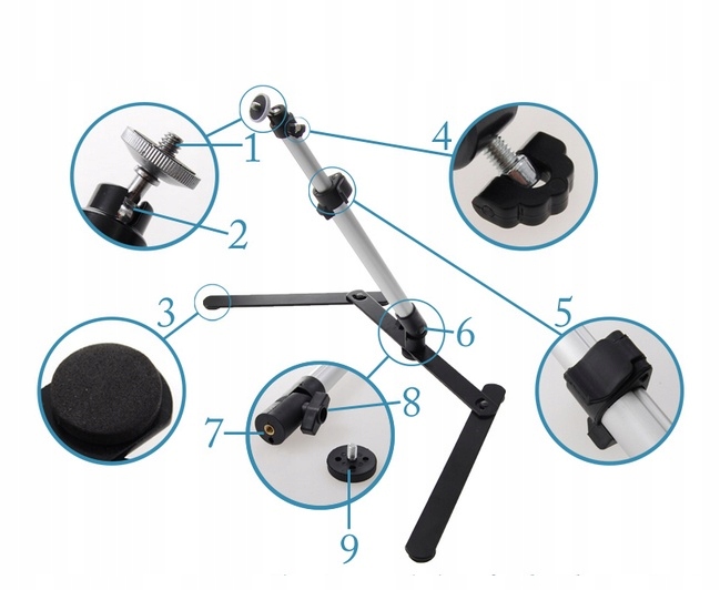 Різьба 1/4" дозволяє встановити будь-яку камеру і камеру зі стандартним різьбовим входом, що дозволяє нахиляти стрижень як вперед, так і назад є стандартний 1/4" різьбовий вхід, який розміщує його на більшому штативі, наприклад. Висота штатива регулюється від 29 до 45 см.