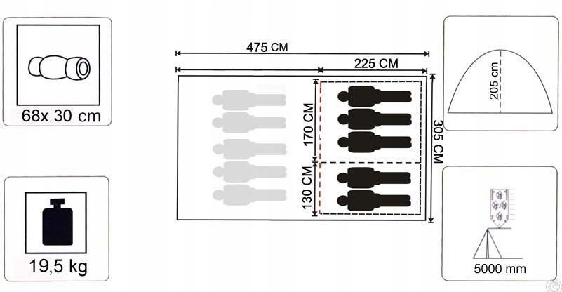 Розмір намету 4,75 м х 3,05 х 2,05 м дозволяє використовувати велику та простору спальню 3,00 м х 2,30 м з висотою 2,05 м.