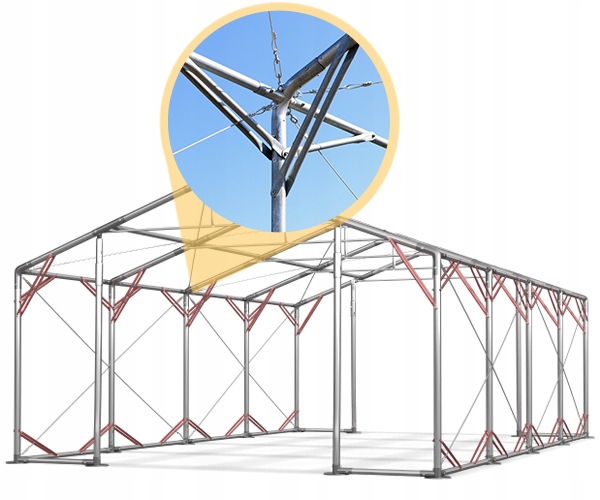 Конструкція оснащена додатковими, товстими сталевими натяжними мотузками на даху та бічних стінах. Вони кріпляться до конструкції з римськими гвинтами, які забезпечують адекватне напруження мотузки. Це рішення додає жорсткість і довговічність структури і захищає намет від деформації. Це також забезпечує додатковий захист від поганих погодних умов.