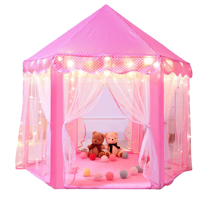 Тканинний намет - однозначно незамінний супутник під час дитячих пустощів. Має шестикутну основу, 6 вхідних отворів і дах у формі піраміди. Іграшка має привабливий зовнішній вигляд. Рожевий колір покриття та дрібний світлий горошок безсумнівно додають естетичну цінність. Входи закриті напівпрозорими білими шторами, які ідеально поєднуються з рештою намету. Гардинки можна зав'язати або задрапірувати різними способами за допомогою декоративних стрічок. Рішення, використане разом з бантами, додає шарму та урізноманітнює веселощі.
