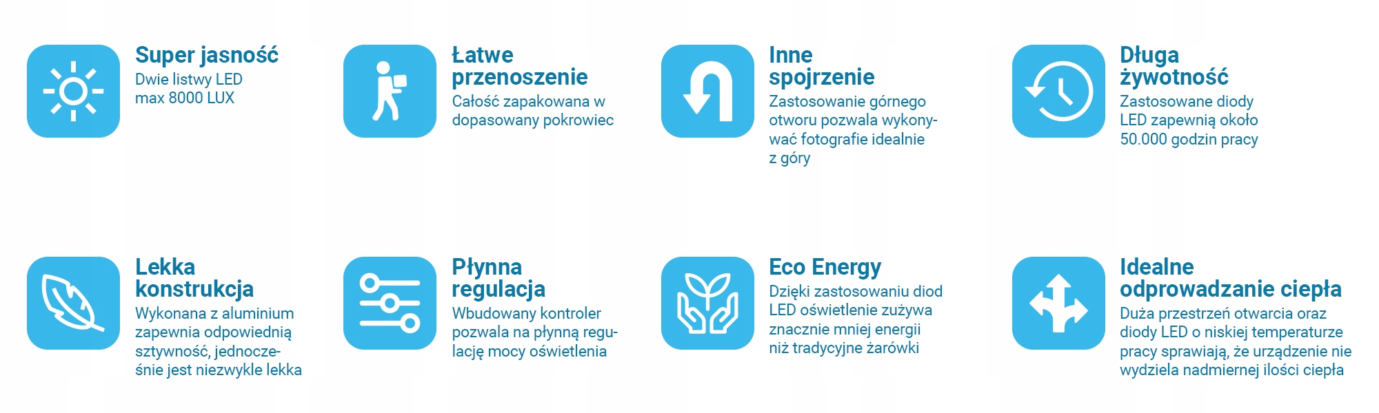 8000 люкс, температура смуги 5500 К та індекс передачі кольору CRI 92+ дозволять вам досягти природних і приємних для ока результатів. Сфотографовані вироби будуть добре освітлені, а кольори будуть правильно передані. Вбудований контролер дозволяє плавно регулювати потужність освітлення. Ви можете легко налаштувати відповідні параметри для отримання найкращих результатів.