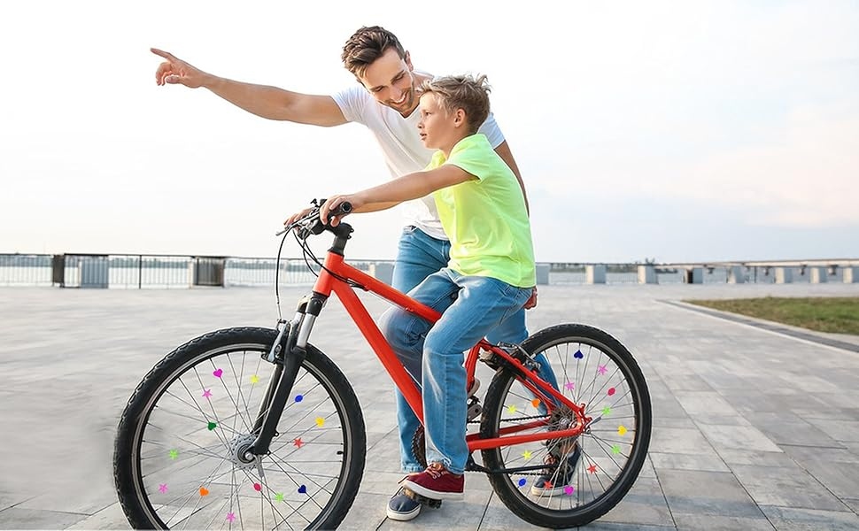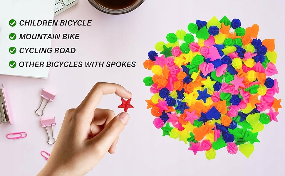 - Цей набір намистин зі спицями для велосипеда включає 144 різнокольорові елементи: 36*круглих світяться намистин, 36*суцільних намистин у формі зірки, 36*суцільних намистин у формі серця та 36 суцільних намистин круглої форми.