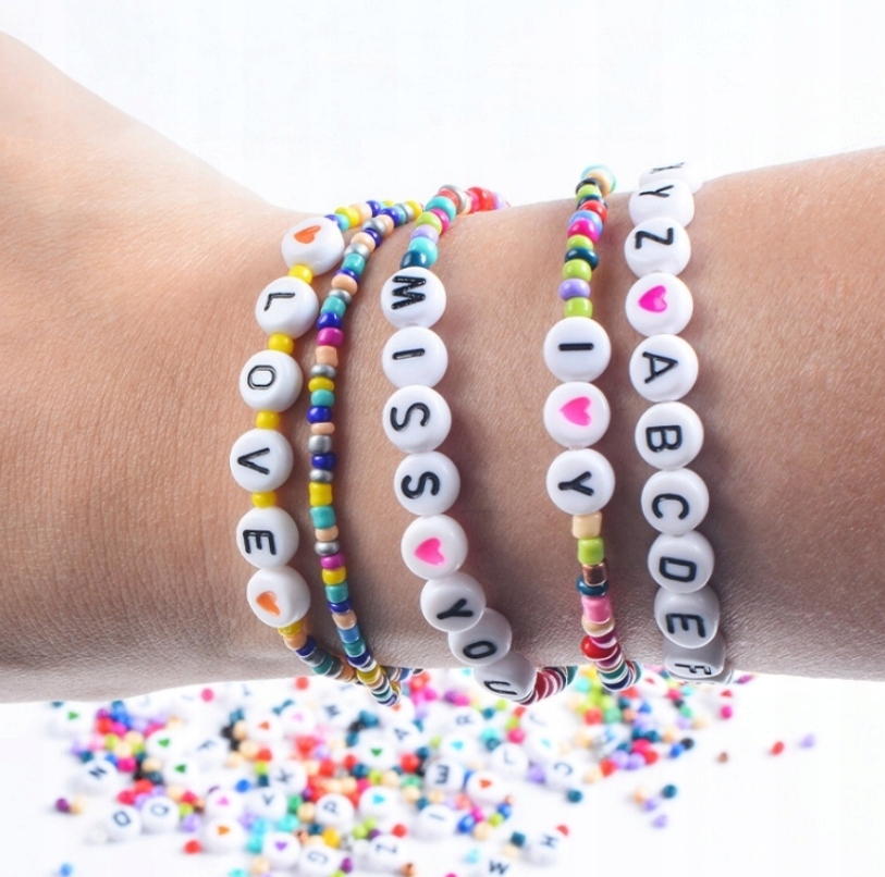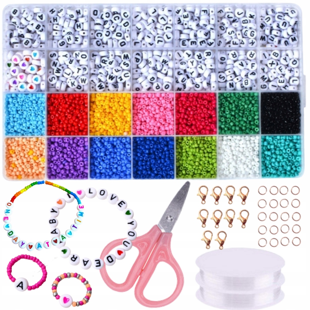 У наборі ви знайдете маленькі насінні намистини, гнучкі силіконові гумки для котушок, круглі літери, ножиці, клітини та кріплення та модні декоративні намистини, які дозволять створити унікальні браслети, ідеально підходячи для всіх випадків.