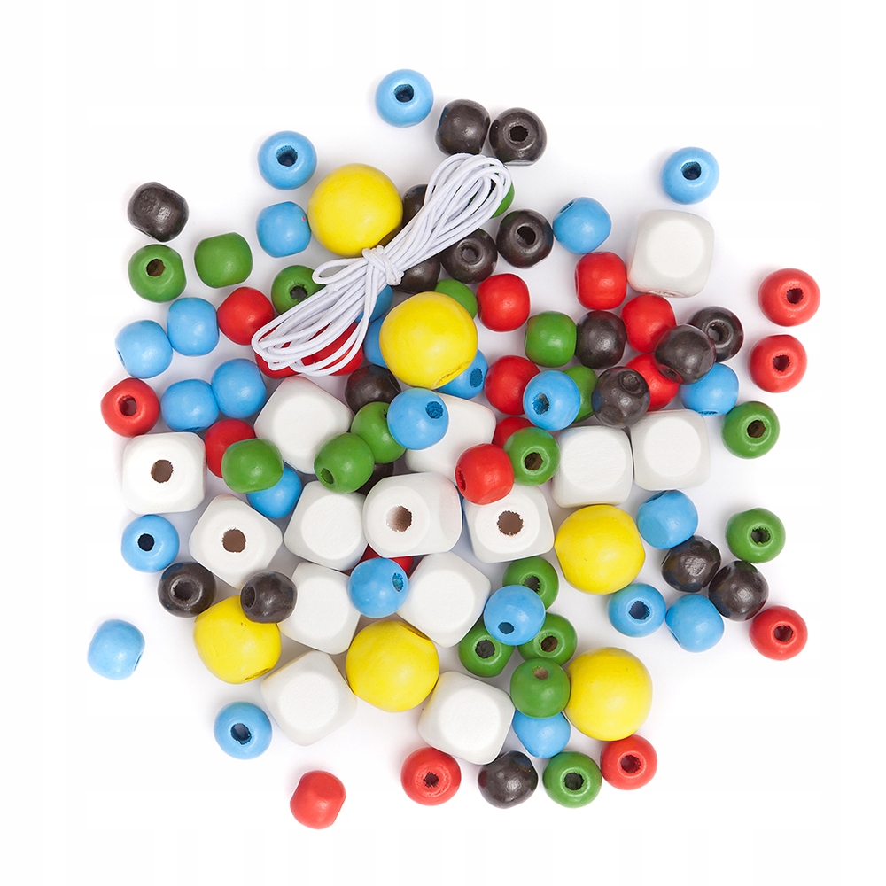 В упаковці ви знайдете: кубики 15 мм (білі), кульки 10 мм (червоні, зелені, сині та чорні) та кульки 15 мм (жовті). Намистини пофарбовані водоемульсійною фарбою. У набір також входить біла еластична нитка для пронизування бісеру.
