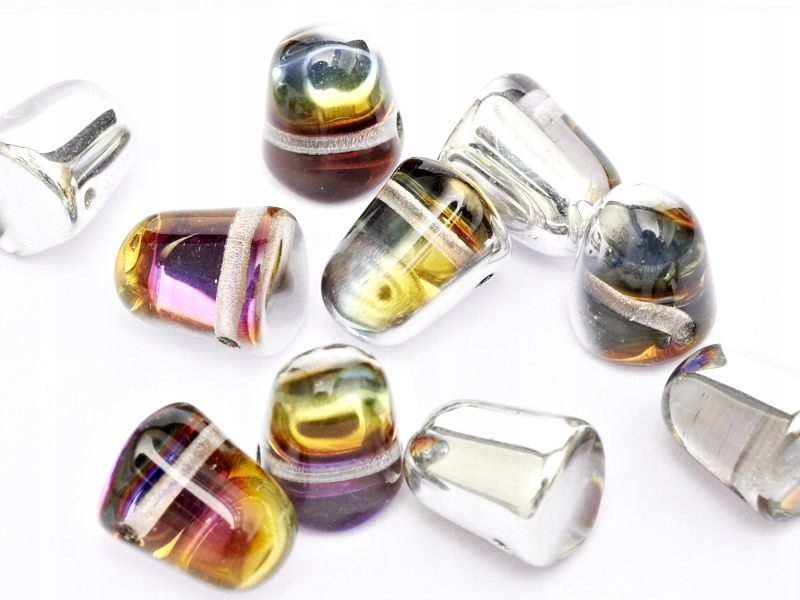 Чеські скляні намистини високої якості у формі заокругленого конуса, висотою близько 10 мм, з плоскою основою, діаметром близько 7 мм. В основі намистини проходить отвір діаметром приблизно 0,8 мм. Прозорий, наполовину вкритий сріблястим металевим напиленням, всередині бусинка опалесцентна.