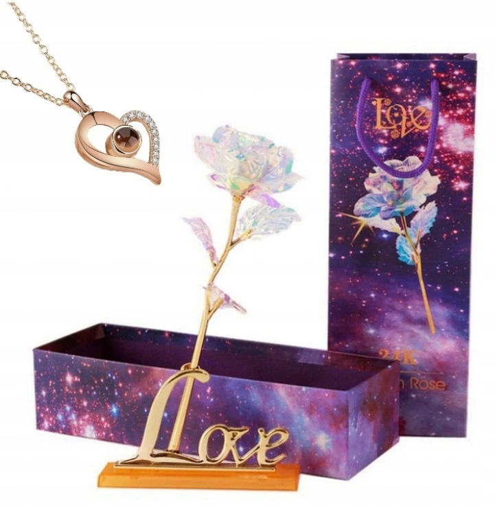 Набір включає одну частину барвистої троянди разом із декорованою підставкою з написом "Love". > Усе це запаковано в подарункову коробку та відповідний паперовий пакет.