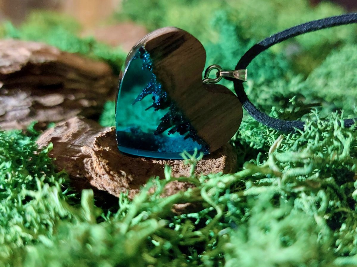 Дерев'яне намисто у формі серця з блакитної смоли та деревини американського горіха