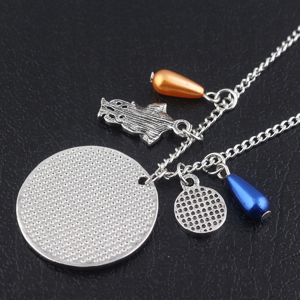 Кольє виготовлено з металу сріблястого кольору, довжина ланцюжка близько 50 см, діаметр найбільшого кулона близько 3 см.