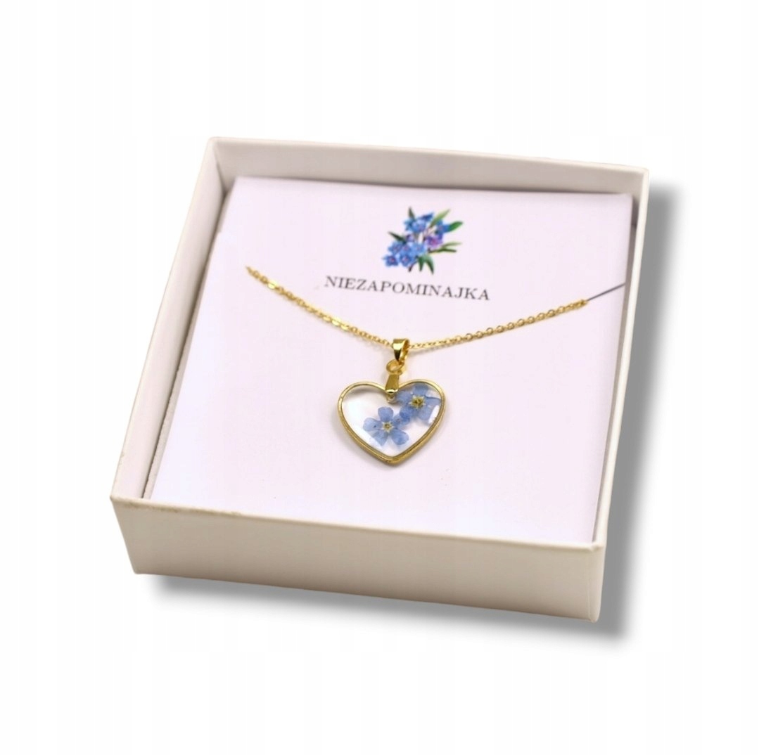 Ми представляємо своє нове, красиве намисто з золотистої нержавіючої сталі. Делікатне серце з тонкими, синіми квітами забуває -Me -Ноти, символізуючи любов і щастя.