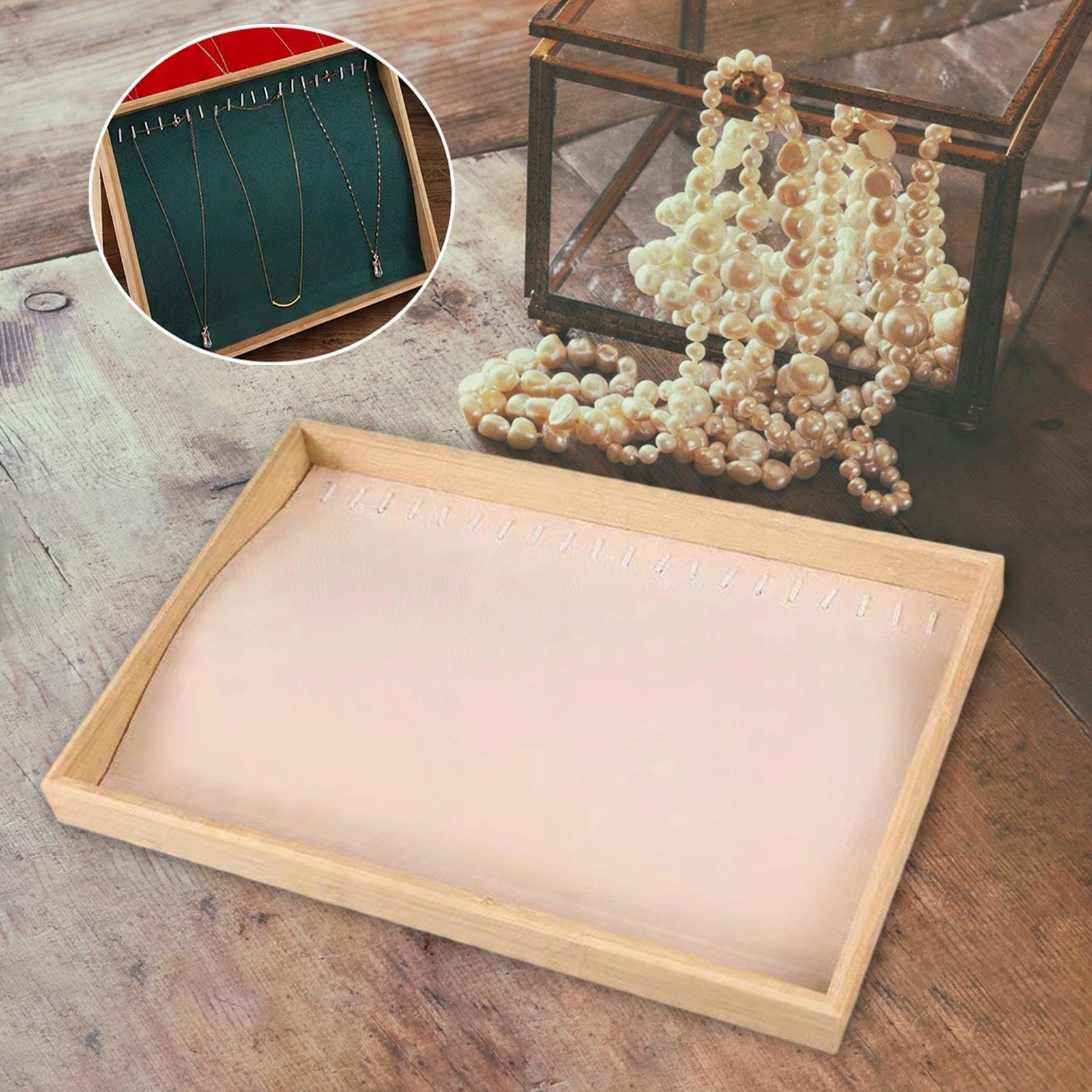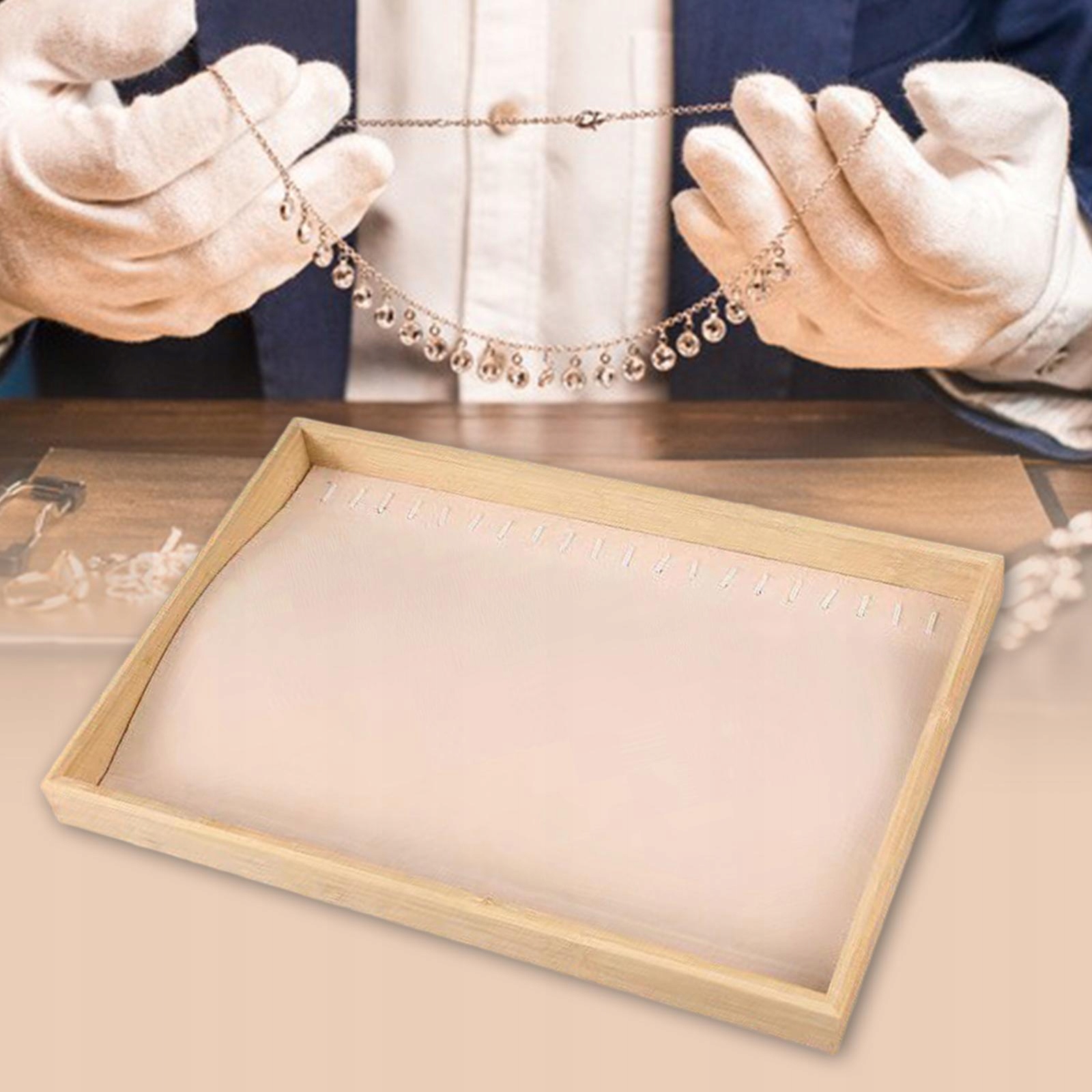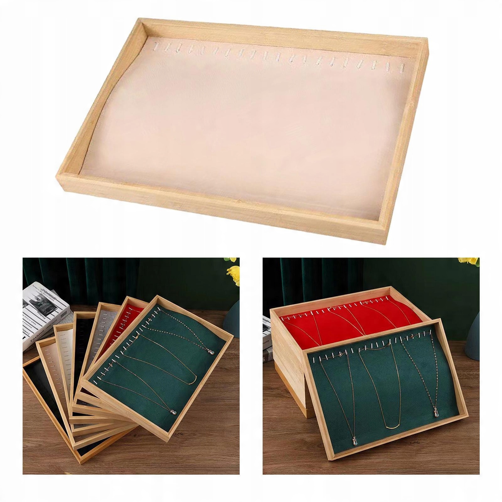 Матеріал: Дерево та оксамит. Побудований із суцільної композитної пластини, загорнутої в оксамитову тканину, м’яку на дотик та захищає свої прикраси та аксесуари від усіх видів пошкоджень або стирання