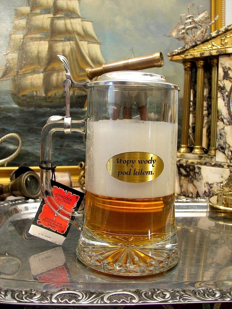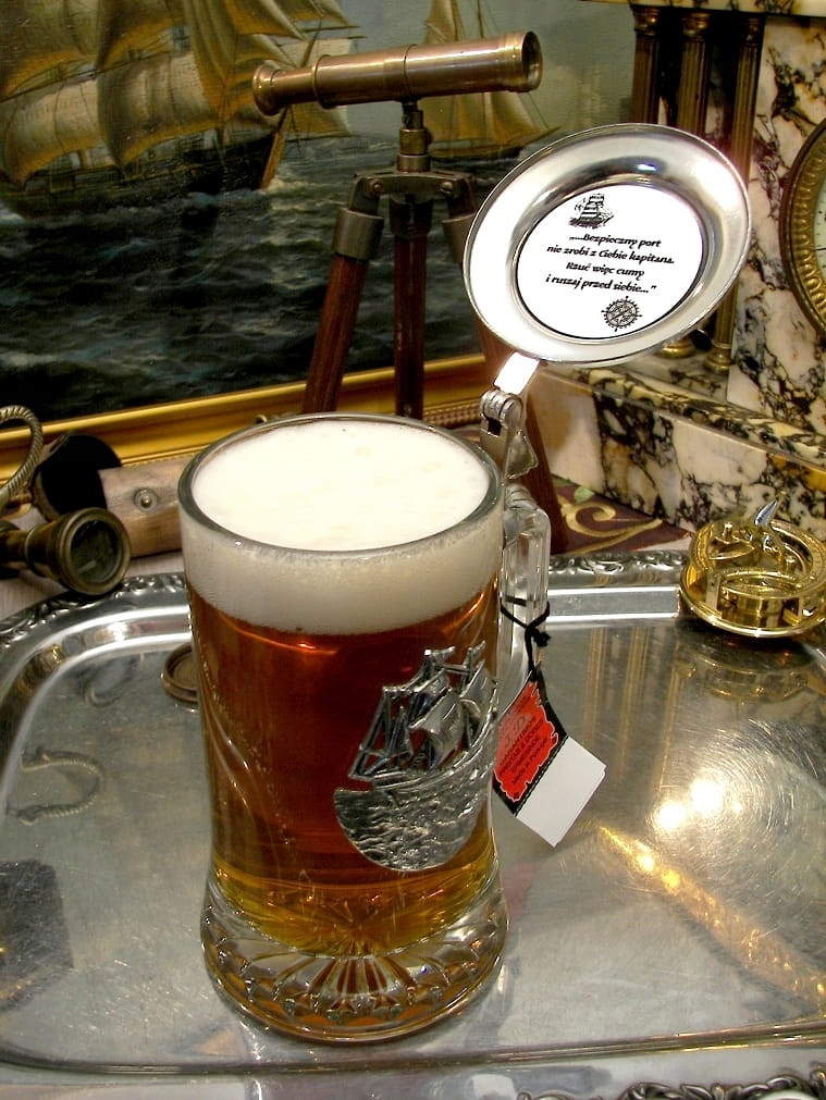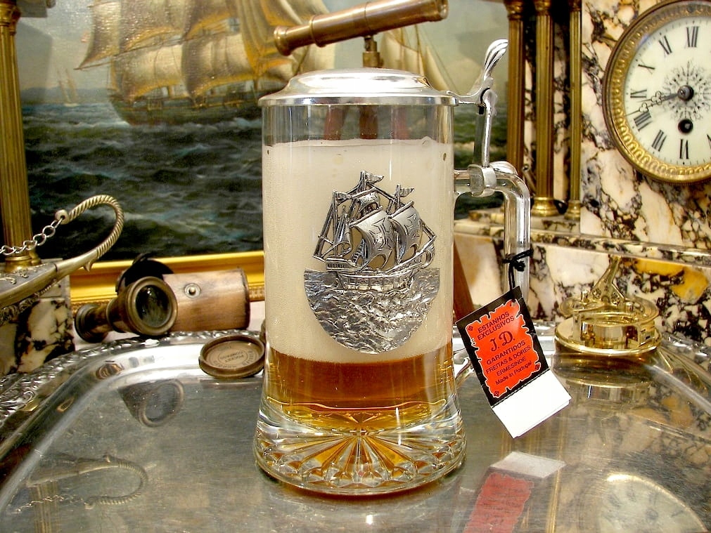 Запрошую придбати привабливу кухоль з кришкою для морського вовка. З білого скла. З одного боку він прикрашений барельєфом із зображенням корабля під повними вітрилами. Виглядає як Санта-Марія Колумба.