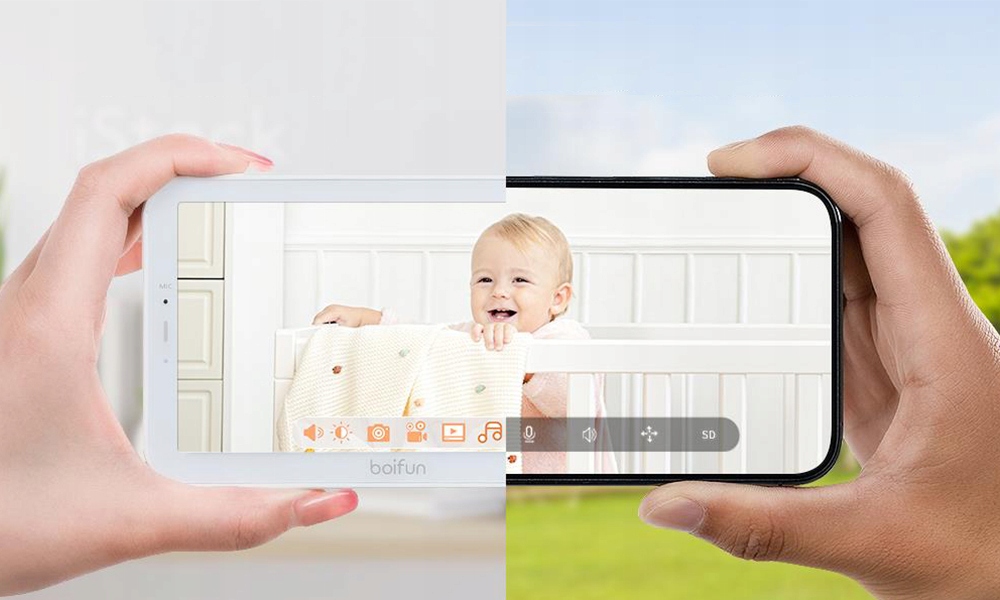 Розумний радіоняня BOIFUN підтримує РК-монітор (сигнал 300 м) і підключення до мобільний додаток (потрібен Wi-Fi), незалежно від того, проводите ви вільний час вдома, йдете в супермаркет чи працюєте в офісі, ви можете бачити свою дитину через мобільний телефон або монітор.