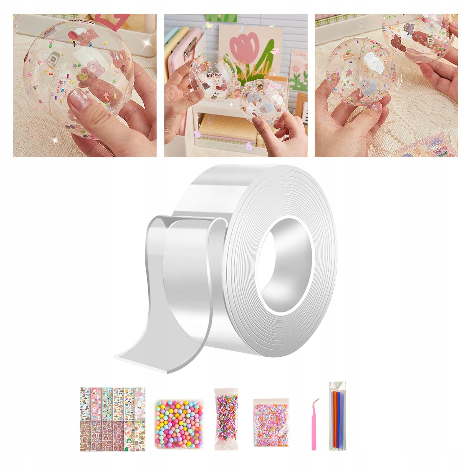 Сильна, нерозумна подвійна стрічка: сильна клейка стрічка з багаторазовим використанням, з сильними властивостями адсорбції та гідроізоляцією. -зайди подвійної стрічки. 2. Складіть навпіл, покладіть у матеріали для самостійного виготовлення і обережно ковзайте краї; 3. Обробляйте папір з підшерстя на поверхні і будьте обережні, щоб не склеїти середню частину разом; 4. > Вміст упаковки: 1 рулон стрічки, 12 аркушів наклейок, 1 мішок барвистих намистин, 1 мішок барвистих молекул, 1 мішечок зірок, 1 пінцет, 10 штук