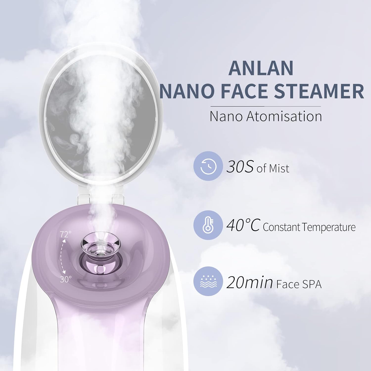 【Технологія наноспрею】 Розпилювач викидає наночастинки води густим дрібним туманом. Обробка тепловим потоком випарника ефективно відкриває пори та допомагає видалити з пор бруд і старіючі кератиноцити, допомагає шкірі дихати, сприяє кровообігу обличчя та забезпечує належне зволоження шкіри.