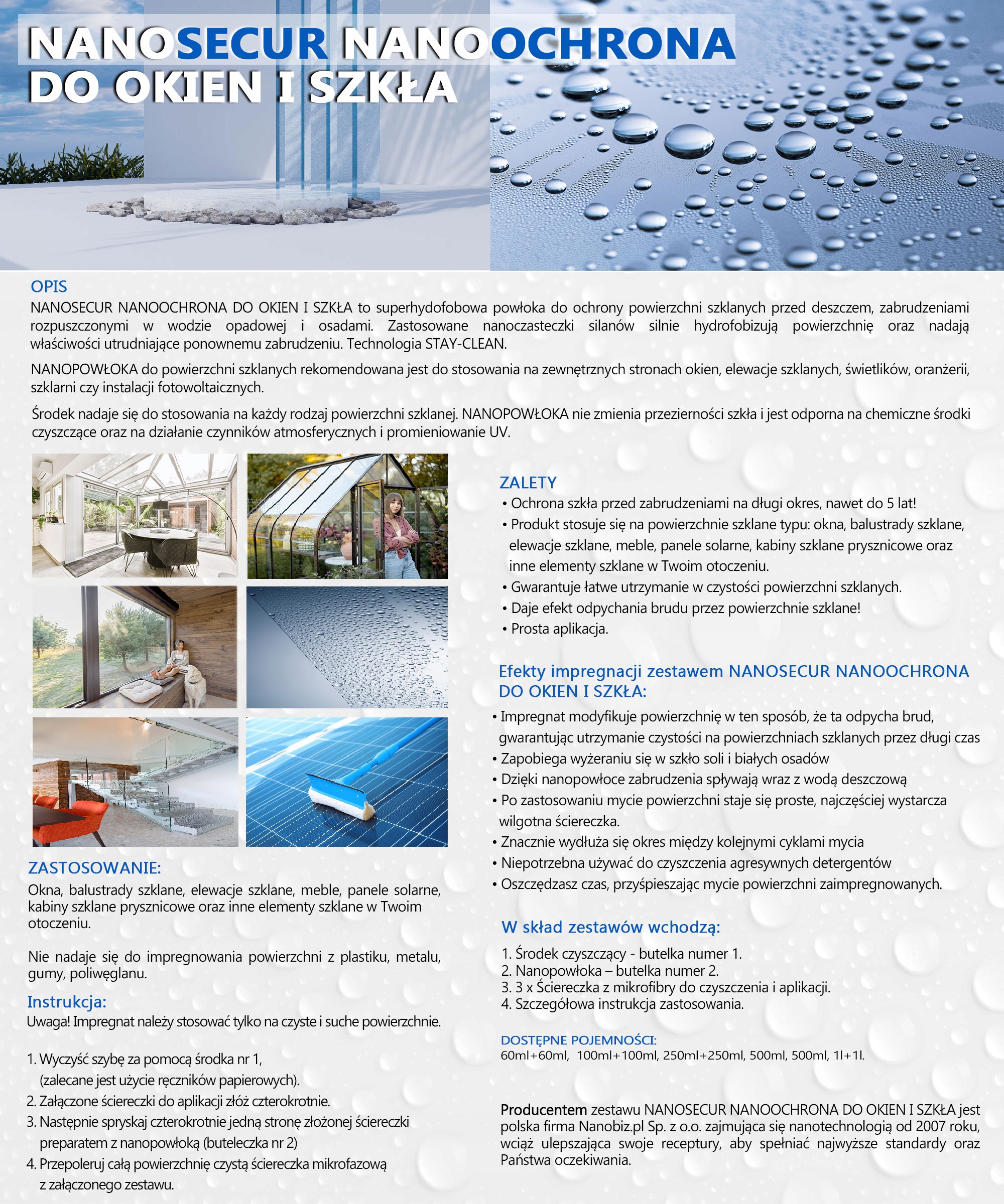 наносекур наночер для вікон та окулярів - це супергідофобне покриття для захисту скляних поверхонь від дощу, бруд, розчинений у дощовій воді та відкладах. Силанські наноокаски використовували сильно гідрофобізують поверхню і дають властивості, які ускладнюють забруднення. Технологія, що очищається.