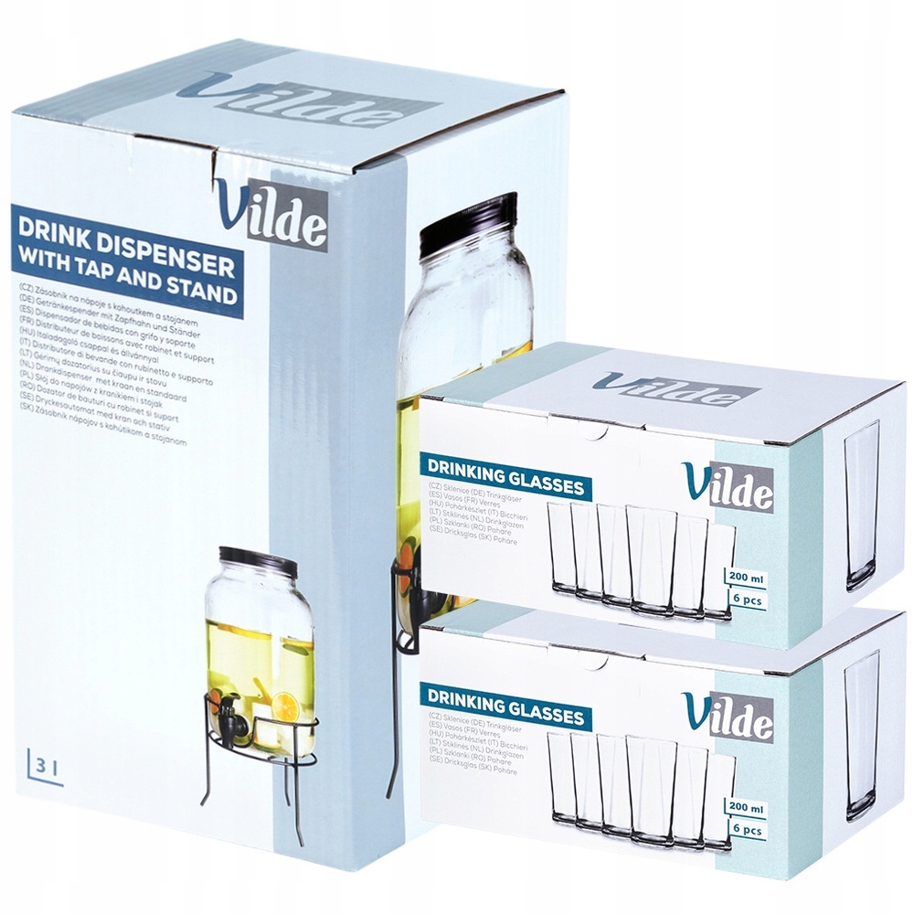 Набір складається з баночки з краном, підставки під баночку та склянок. Ідеально підходить для подачі води, лимонаду, соку, холодного чаю, ароматизованої води, а також пуншу. Завдяки крану ви можете легко подати улюблені напої в ефектному вигляді. Ми можемо використовувати банку з підставкою як в саду, так і під час сімейних посиденьок. Завдяки закритій кришці в наш напій не потраплять комахи. Виготовлена з безпечних для здоров'я та харчових продуктів матеріалів. Не підходить для гарячих напоїв. Увага! Упаковка містить невірну інформацію щодо ємності, фактична ємність відповідає наведеному вище опису. Оригінальна продукція Vilde. Виготовлена відповідно до європейських стандартів.