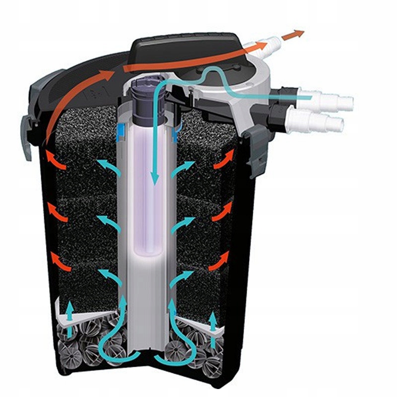 Вода, що надходить в УФ-фільтр KLARPRESSURE, проходить через 3 шари губки, яка очищає воду від механічних домішок. Потім вода піддається біологічній фільтрації. Вода, що витікає з УФ-фільтра KLARPRESSURE, стерилізується.