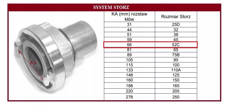 Розмір муфт STORZ можна визначити двома способами. Перше - це традиційне маркування, пов'язане з номінальним діаметром шланга (наприклад, 52-B), друге - внутрішня відстань гачків. Ви можете з’єднувати елементи з однаковою відстанню гачків.
