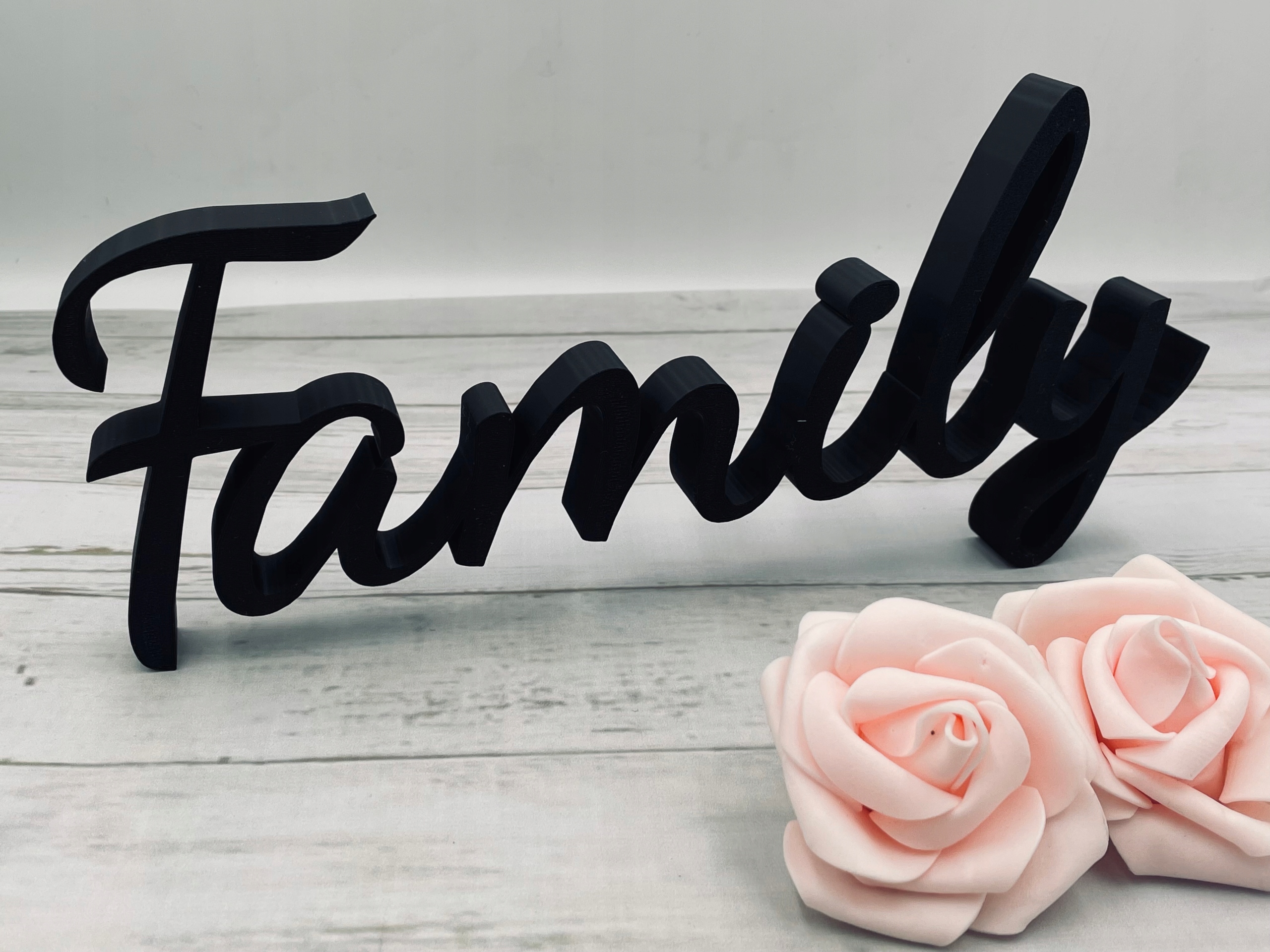 Предметом продажу є напис "СІМ'Я" з пластику, завдяки чому він виглядає красиво, міцний і не потребує догляду. Розмір напису приблизно 27 см в довжину і 18 мм в товщину, тому її можна розмістити на рівній поверхні, не боячись перекинутися. Крім того, завдяки малій вазі його можна приклеїти до стіни двостороннім скотчем (не входить в комплект)