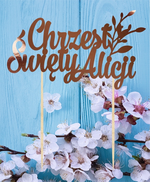 Топпер, напис на Святе Хрещення рожевим золотом з ім'ям дитини та декоративними гілками. Персоналізований виріб підкреслить неповторність свята та стане ідеальним акцентом на торті чи букеті. Декоративний козирок із дзеркального рожевого золота красиво переливається на світлі та «дзеркально» відображає предмети. Топпер виготовляється за індивідуальним замовленням клієнта.