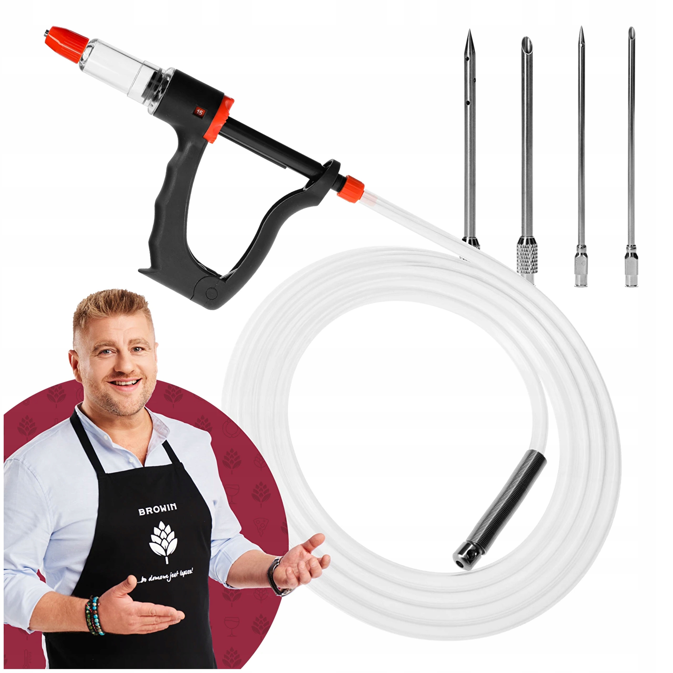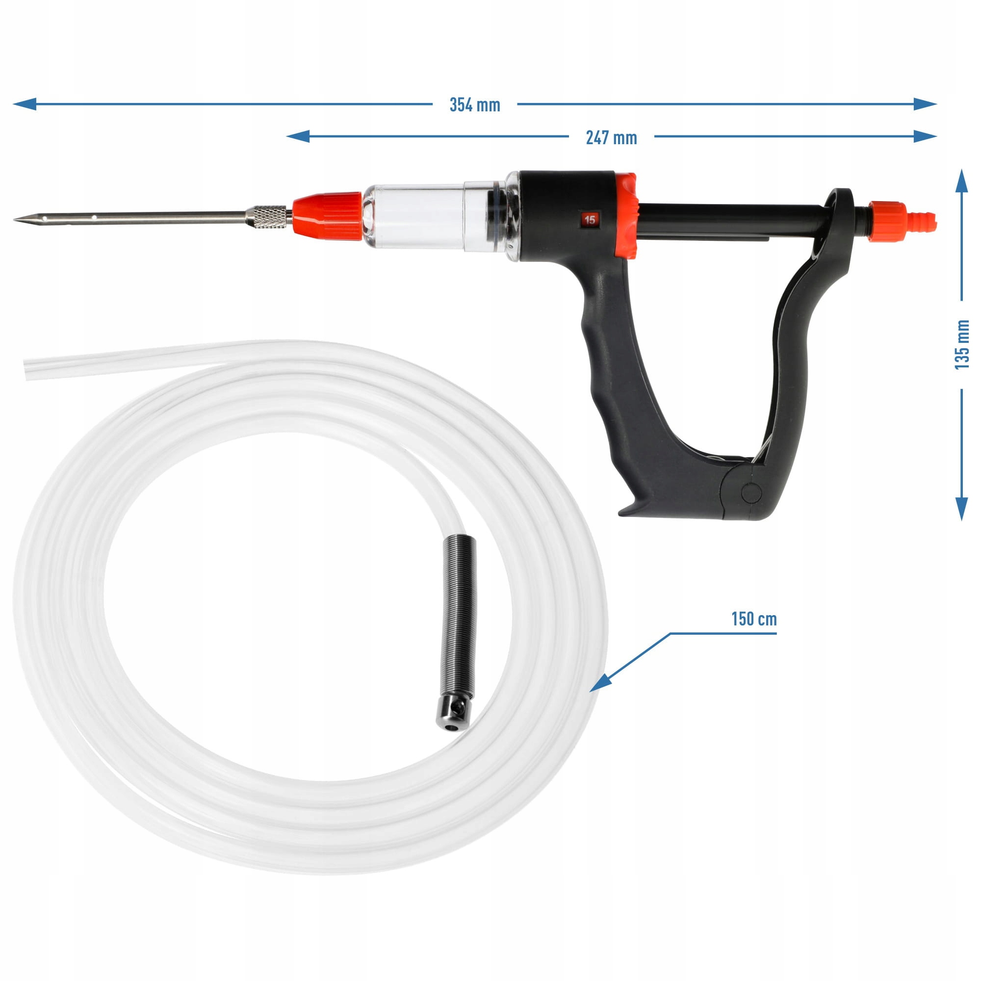 Довгий пластиковий шланг з довжиною 1,5 м, з вагою, дозволить вам витягнути розсол із страви в потрібній кількості - залежно від розміру вилікованої порції, структури м'яса та показань у рецепті. Ви оціните стабільність голки, багатофункціональну, ергономічну ручку для висмоктування соління і м'яса, а також автоматичного наповнювального резервуара та регульованого обсягу нахилу (5, 10, 15 мл). У наборі ви отримуєте 4 голки з різними діаметром: 2 ПК з Ø3 мм та 2 шт. З Ø5 мм, а також запасне кільце (кріплення кільця для голки).