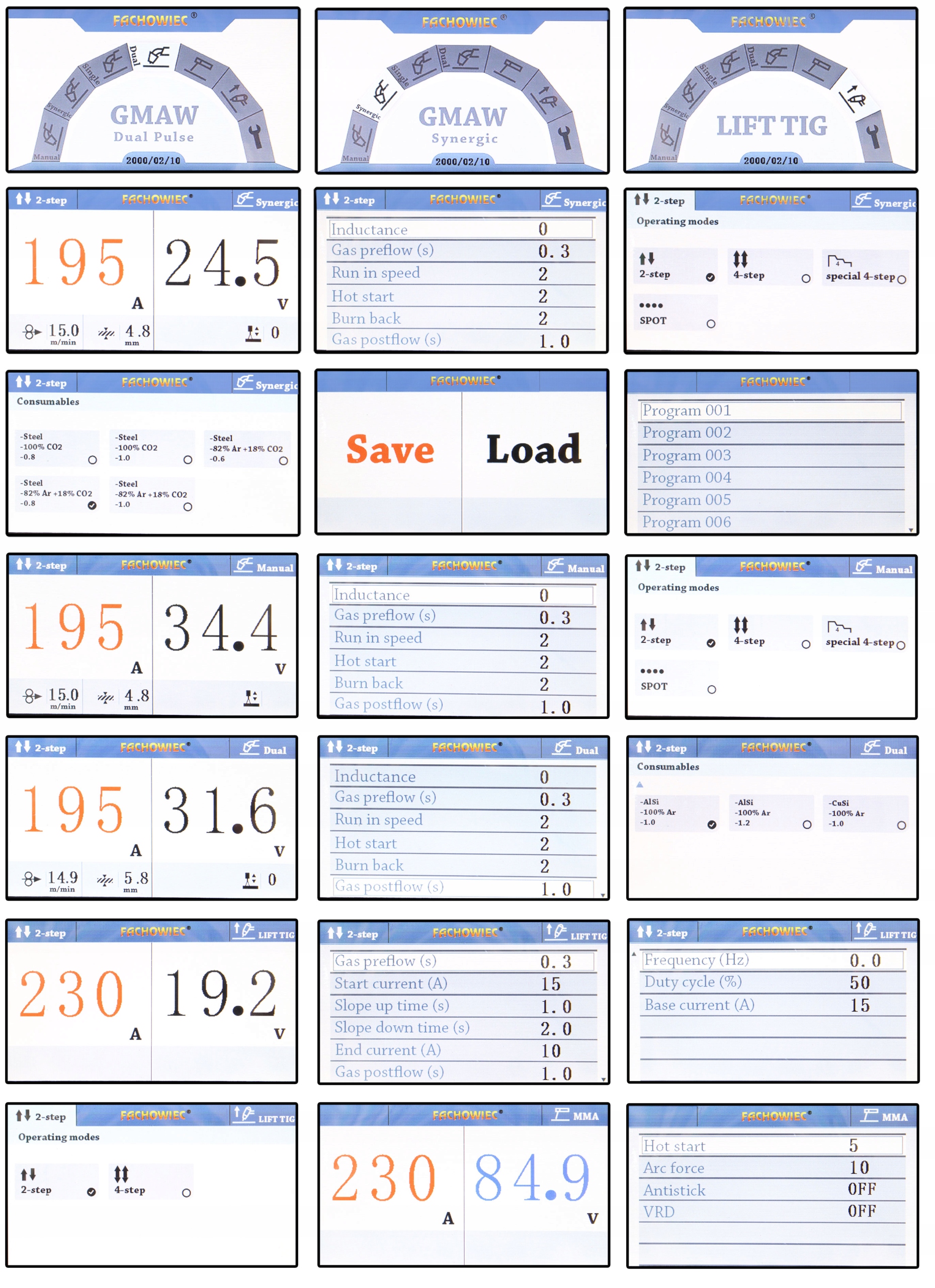 АВТО - синергетичні налаштування. В режимі AUTO користувач вибирає основні параметри зварювання, такі як тип матеріалу, товщина зварюваного матеріалу та діаметр зварювального дроту. Решта параметрів вибираються пристроєм автоматично за допомогою бази попередньо завантажених програм. Автоматичний режим дозволяє зварювання лише безперервним струмом - неможливо налаштувати параметри режиму PULS і подвійного PULS.