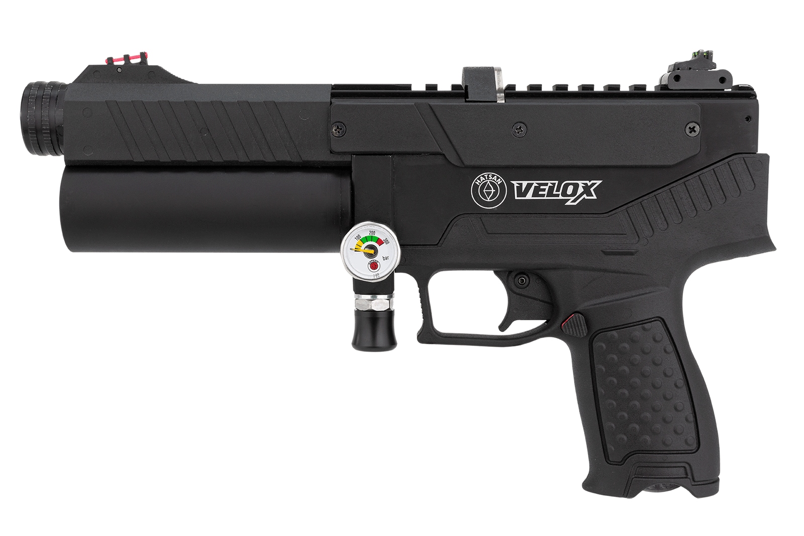 Velox має подвійну рейку 11 мм і 22 мм, що дозволяє встановлювати різні аксесуари, і регульовану систему прицілювання з трьома). Оптоволоконні наконечники (Tru-Glo) забезпечують ергономічний дизайн, а додатковий магазин можна зберігати в спеціальному тримачі, що дозволяє плавно стріляти після пострілів. Velox оснащений ручним запобіжником рухомий.