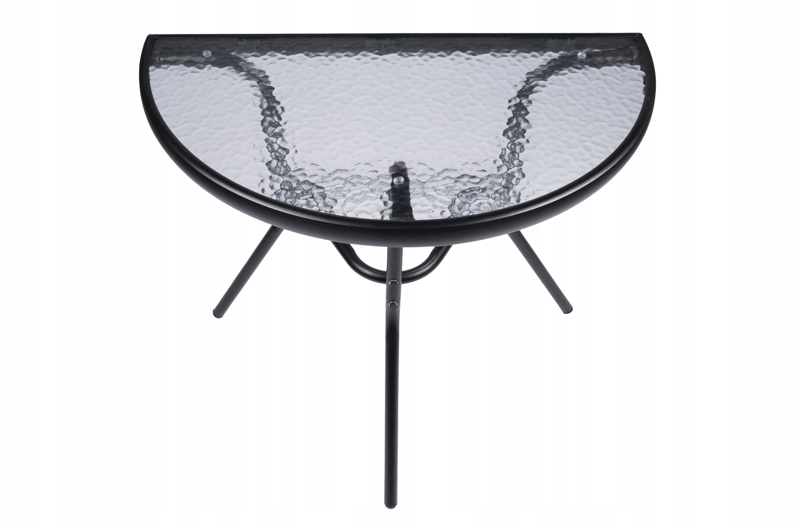 Міцна сталева конструкція зі скляною стільницею ідеально вписується в невеликі приміщення. Стіл ідеально підходить для балкона, тераси або саду. Стіл має три стійкі ніжки, виготовлені з матеріалів, стійких до погодних умов.