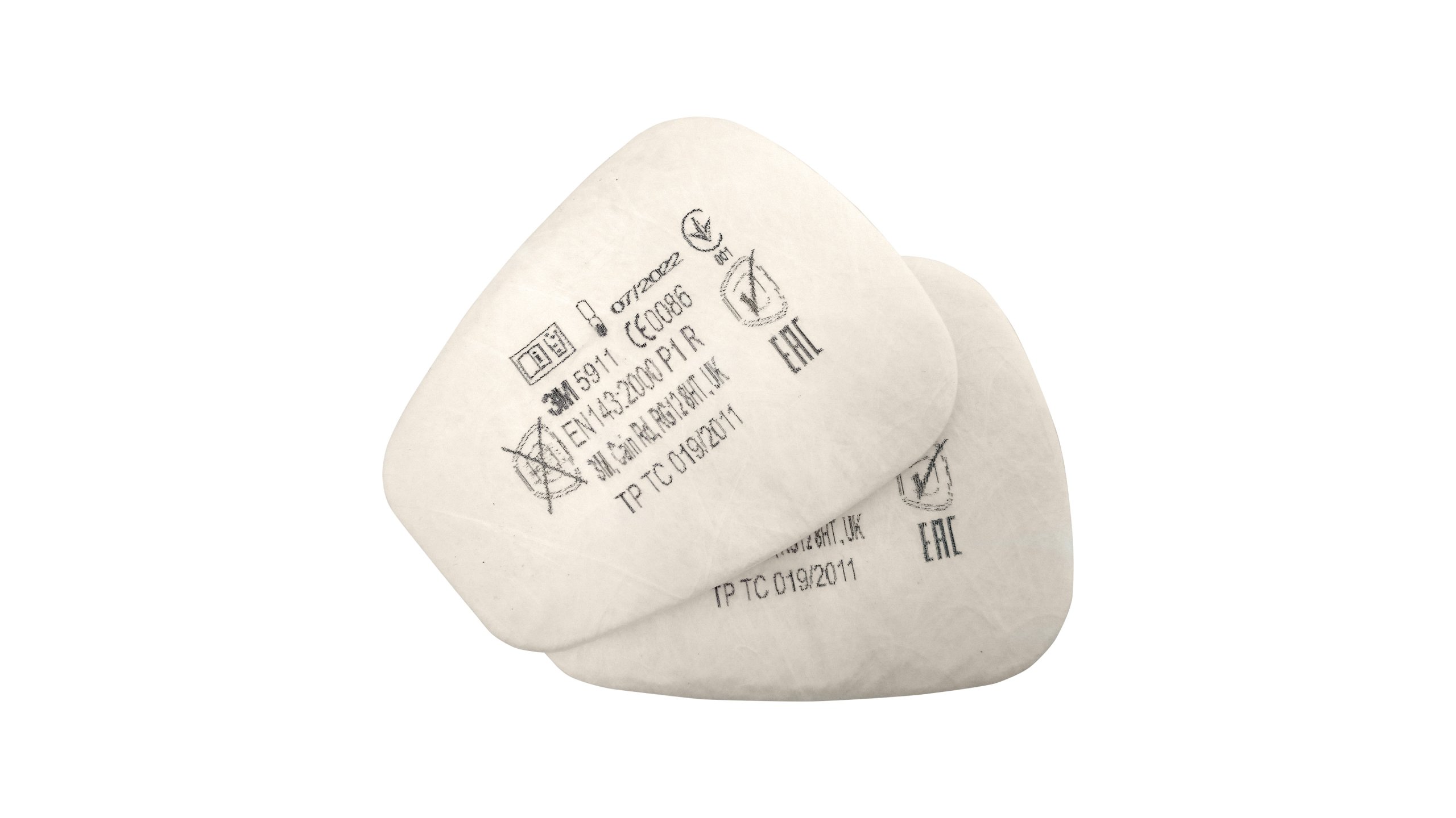 Пиловий фільтр 3M™ 5911 з класом захисту P1 - ефективність фільтрації 80% - використовується для захисту від твердих і рідких частинок низької токсичності, для яких TLV≥2 мг/м3 з концентрацією до 4xNDS. Відповідно до EN143.