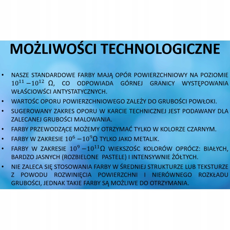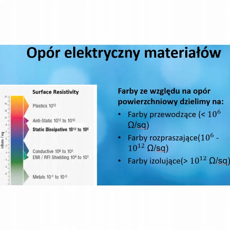 Фарби ESD – це фарби, які розсіюють електростатичні заряди, накопичені на поверхні елемента. Параметром, що характеризує здатність фарби проводити, є поверхневий опір. Чим менше опір, тим краще розсіювання заряду - тим краще провідність покриття.