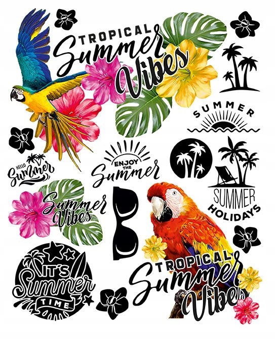 Симпатичні літні пересадки – ідеальна ідея для прикраси хлопчиків і дівчаток Футболки, світшоти, а також шкільний портфель. На представленому аркуші є наклейки на папуги та інші цікаві тропічні мотиви.