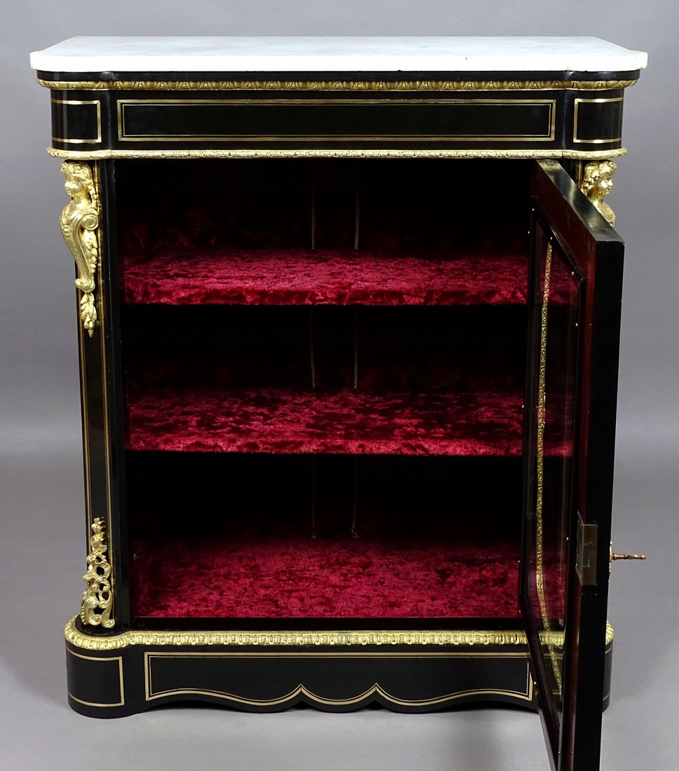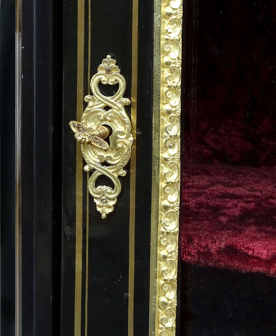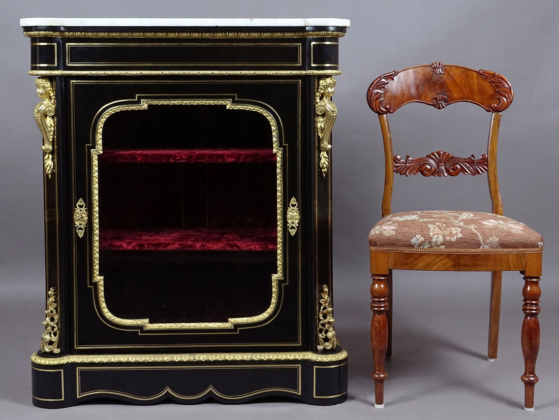 з одним скляним дверним крилом та мармуровим верхом, що підтримується на п’єдесталі з ніжним фартухом. Двері, прикрашені широкою, гравірованою, хвилястою латунною смужкою, за якою була розміщена тонка латунна лінія. На периметрі дверей та з боків прикраси у вигляді двох вен різної ширини. Сторони вирізаних меблів, прикрашені вгорі позолоченими бронзовими застосуваннями у вигляді жіночої голови з листям під ним, а внизу композиція квітки відкритої роботи також виготовлена з позолоченого коричневого кольору. Сталь, нанесена за допомогою ключового замка. Оригінальний мармуровий верх вгорі. Всередині дві полиці, вистелені бордовою тканиною, як і задня частина меблів.