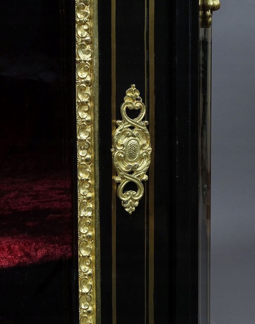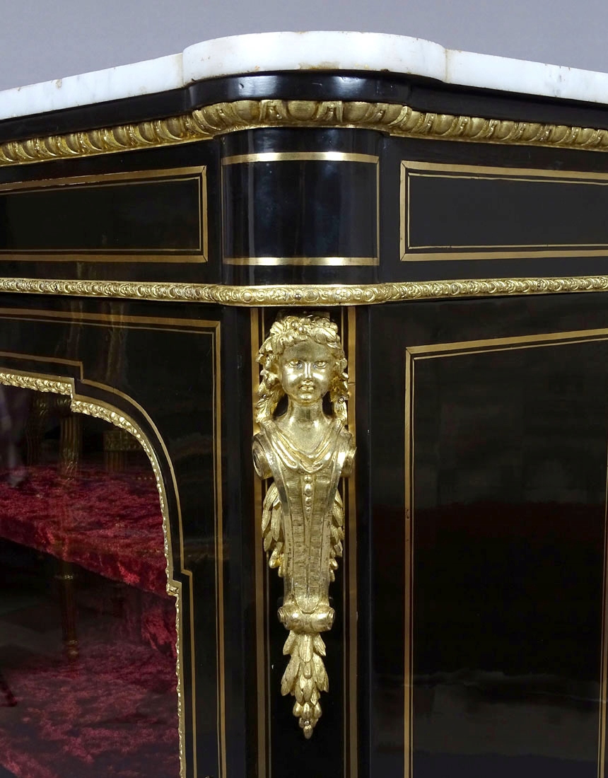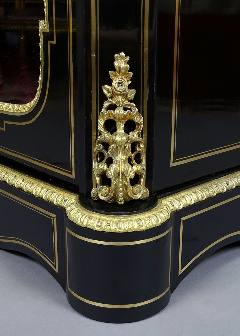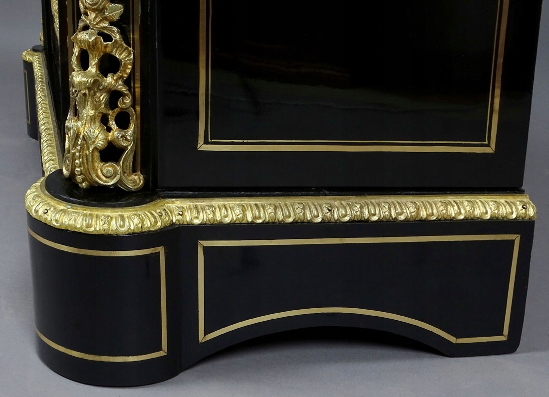 з одним скляним дверним крилом та мармуровим верхом, що підтримується на п’єдесталі з ніжним фартухом. Двері, прикрашені широкою, гравірованою, хвилястою латунною смужкою, за якою була розміщена тонка латунна лінія. На периметрі дверей та з боків прикраси у вигляді двох вен різної ширини. Сторони вирізаних меблів, прикрашені вгорі позолоченими бронзовими застосуваннями у вигляді жіночої голови з листям під ним, а внизу композиція квітки відкритої роботи також виготовлена з позолоченого коричневого кольору. Сталь, нанесена за допомогою ключового замка. Оригінальний мармуровий верх вгорі. Всередині дві полиці, вистелені бордовою тканиною, як і задня частина меблів.