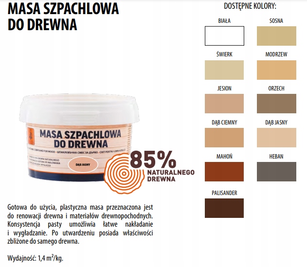 Високоякісна сполука для наповнення деревини. Легко наносити і згладити. Він характеризується чудовою адгезією до підкладки та коротким часом сушіння. Після висихання його можна вирізати, пилячи, шліфувати, лакостили і пофарбувати.