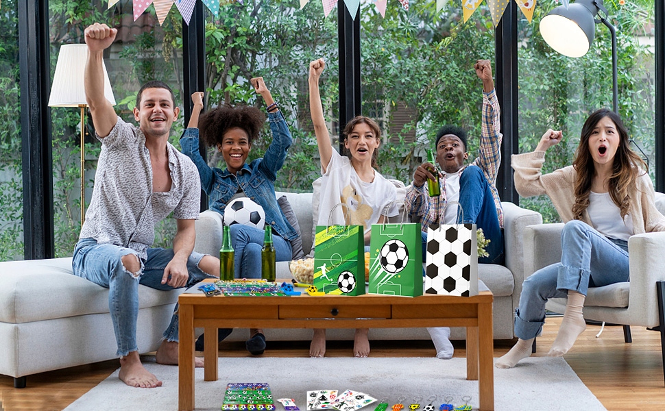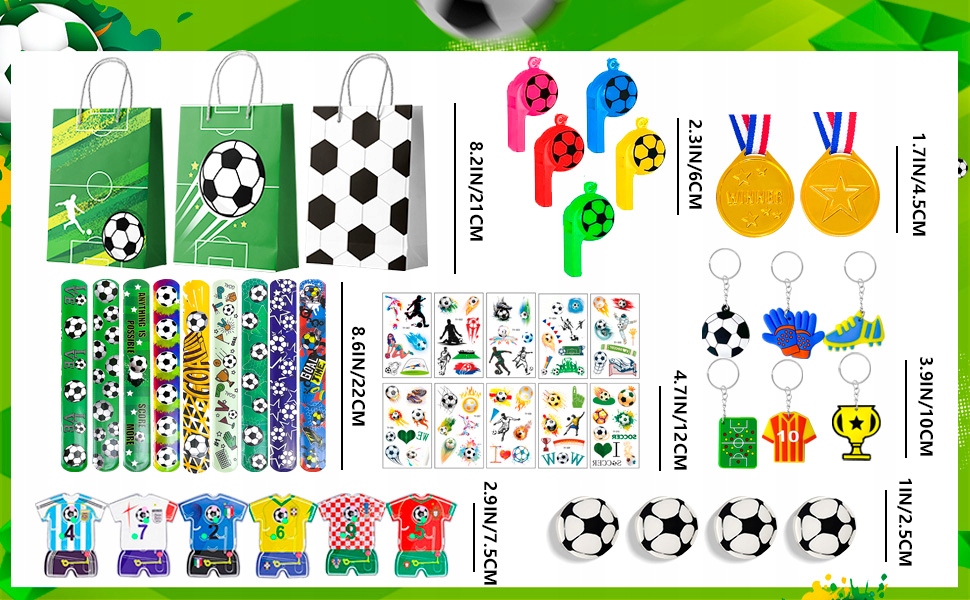 - Ідеальний набір сувенірів для футбольної вечірки: наш набір сувенірів на тему футбольної вечірки включає 12 футбольних браслетів, 12 сумок для футбольних подарунків, 12 футбольних наклейок на день народження, 12 медалей переможця футбольної вечірки тощо. м’ячі.