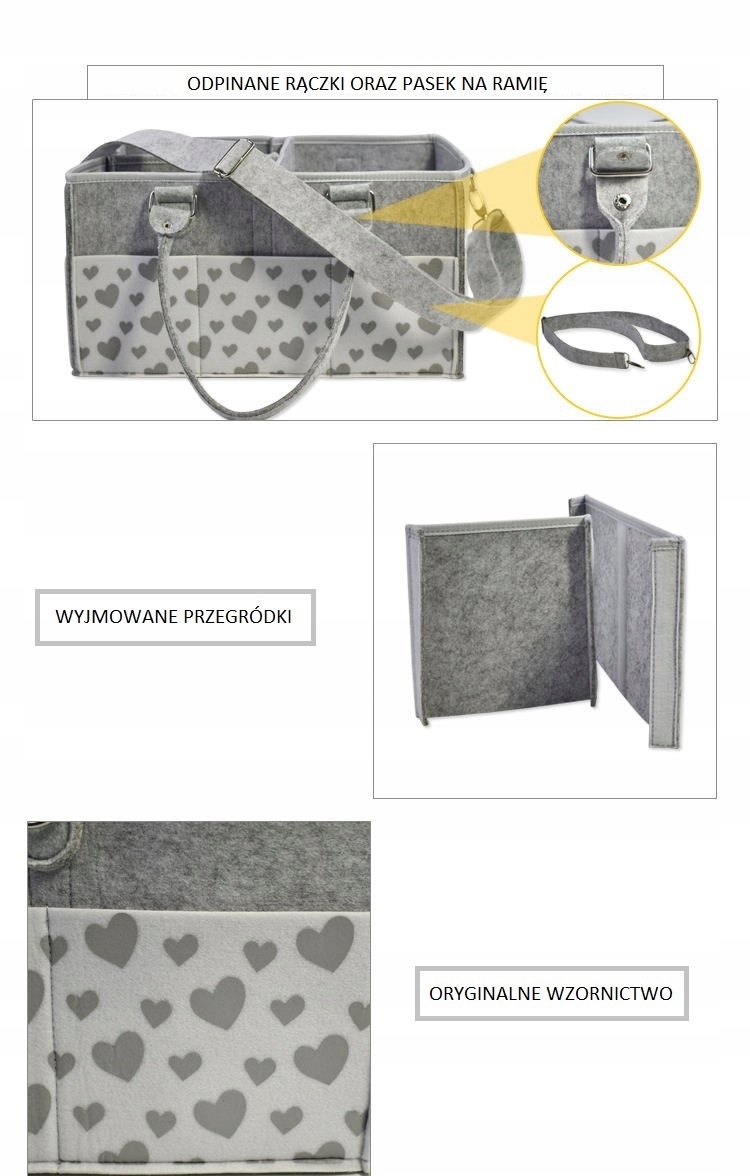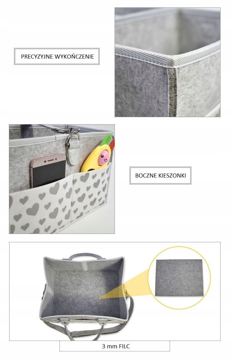 Органайзер виготовлений з фетру 3 мм. Внутрішній простір можна вільно змінювати завдяки рухомим перегородкам (від одного до трьох відділень). Має 8 зовнішніх кишень. У набір входить знімний плечовий ремінь і знімні ручки.