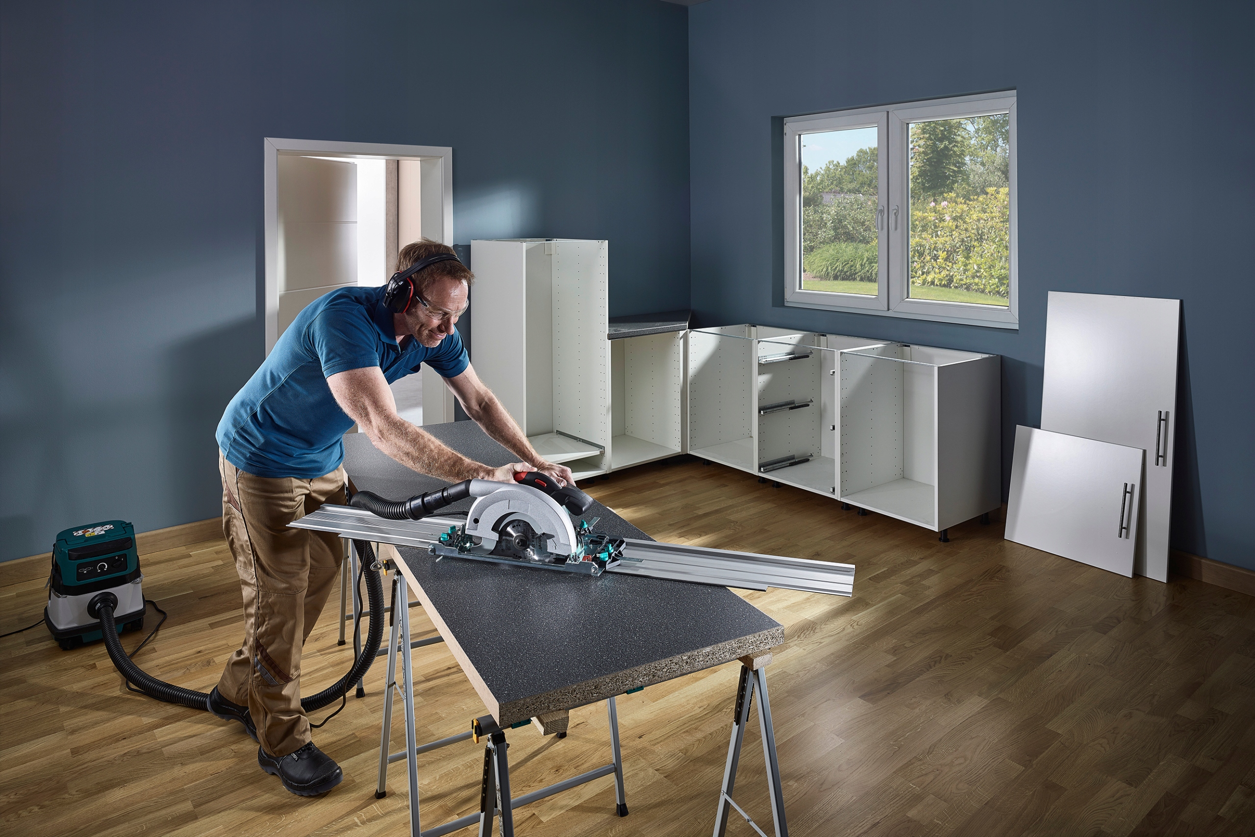 ◼️ ➡️ Для вирізання довших елементів, таких як дверні полотна чи кухонні стільниці, є можливість подовжити напрямну до 220 см за допомогою додаткового комплекту подовжувачів