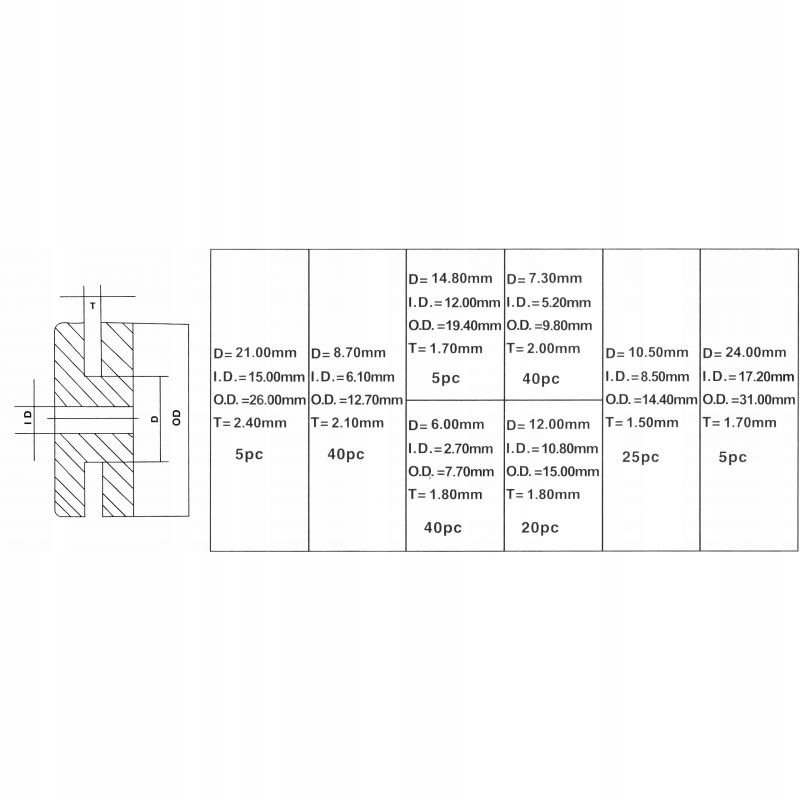 - Набір гумових прокладок, упакованих у практичну коробку, яка дозволяє організувати прокладки відповідно до до своїх розмірів. Повний перелік розмірів ущільнень, що входять до комплекту, можна знайти на упаковці.