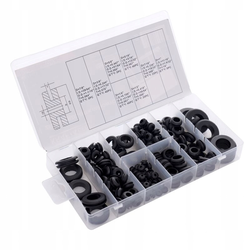 - Набір 180 предметівгумових люверсів для отворів польського бренду Kraft&Dele. Цей набір є необхідним обладнанням для кожної майстерні та гаража. Це надзвичайно кориснодля зменшення діаметра отворів. Люверси також можна використовувати дляоздоблення гострих країв отворів. Набір стане в нагоді там, де є проблема з тим, як обробити отвір, щоб він не пошкодив дроти.