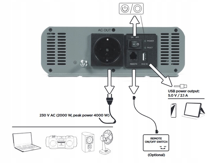 ✔ дозволяє підключати будь -яку електроніку, що працює за допомогою змінного струму (макс. 2000 Вт), наприклад, ноутбуків, hifi або відео обладнання