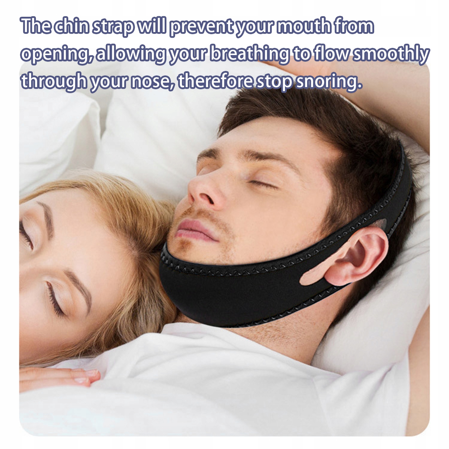 Підборіддя запобігає підборіддям під час сну, завдяки якому губи відкриваються. З закритими губами дихання вільно протікає через ніс, завдяки якому ви перестаєте хропіти. Хропічна смуга виготовлена з гнучкого і м'якого матеріалу, тому ви можете комфортно носити його цілу ніч.