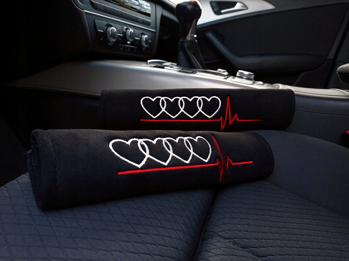 Нижче представлені чохли на ремені з красивого та міцного матеріалу алькантара. Накладки чудово виглядають в автомобілі, а стильна та унікальна вишивка додає їм характеру. На пояси надіті накладки, під ними є губка, яка не ковзає вгору-вниз. Монтаж дуже простий - ми встановили липучки, які потрібно просто розстібнути і встановити виріб на ремені. Матеріал м'який і приємний на дотик, тому лямки приємно сидять на плечі. Якщо у вас є проблема з тим, що ремінь безпеки кусає шию і доставляє незручність, а відрегулювати його в автомобілі вже недостатньо, наші накладки стануть ідеальним вирішенням цієї проблеми. Крім того, красива вишивка на них додасть делікатну порцію жвавості салону автомобіля.