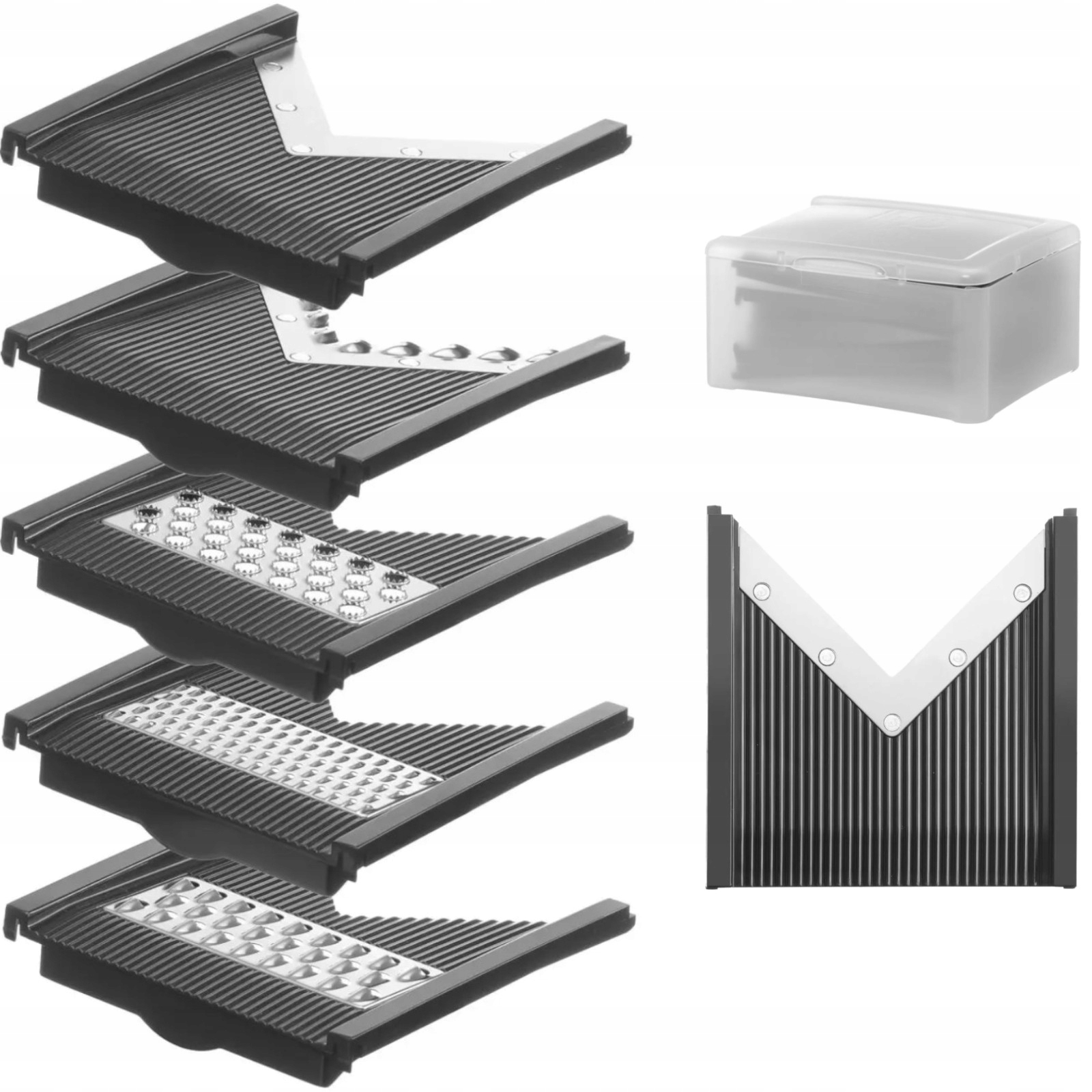 Відрізні диски торгової марки Hendi призначені для мандоліни типу V, код 222614 цього ж бренду. У комплект входить: стандартне лезо для шинкування, хвилеподібне лезо для нарізки, з рифленою поверхнею, лезо для натирання напр. твердий сир, шоколад, дві лопатки для стружки, з маленькою і великою дірочками. Набір можна мити в посудомийній машині.