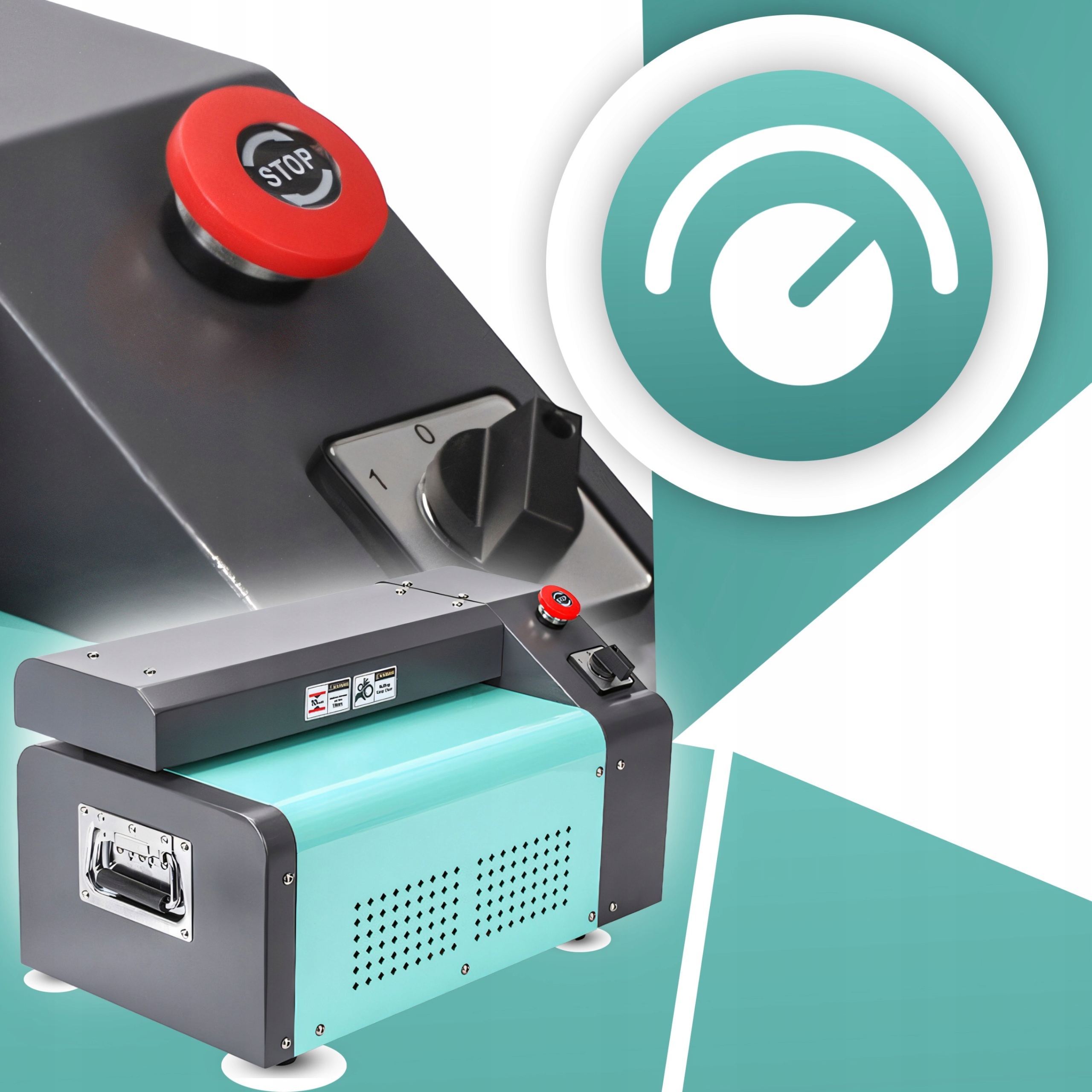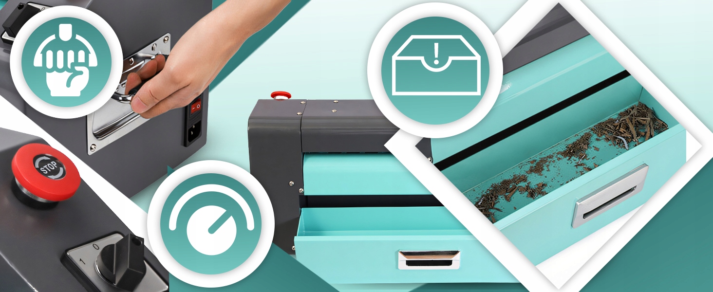 Ручка дозволяє регулювати темп операції залежно від товщини матеріалу, а червона кнопка Stop забезпечує безпеку використання, , що дозволяє негайно зупинити машину , якщо це необхідно.
